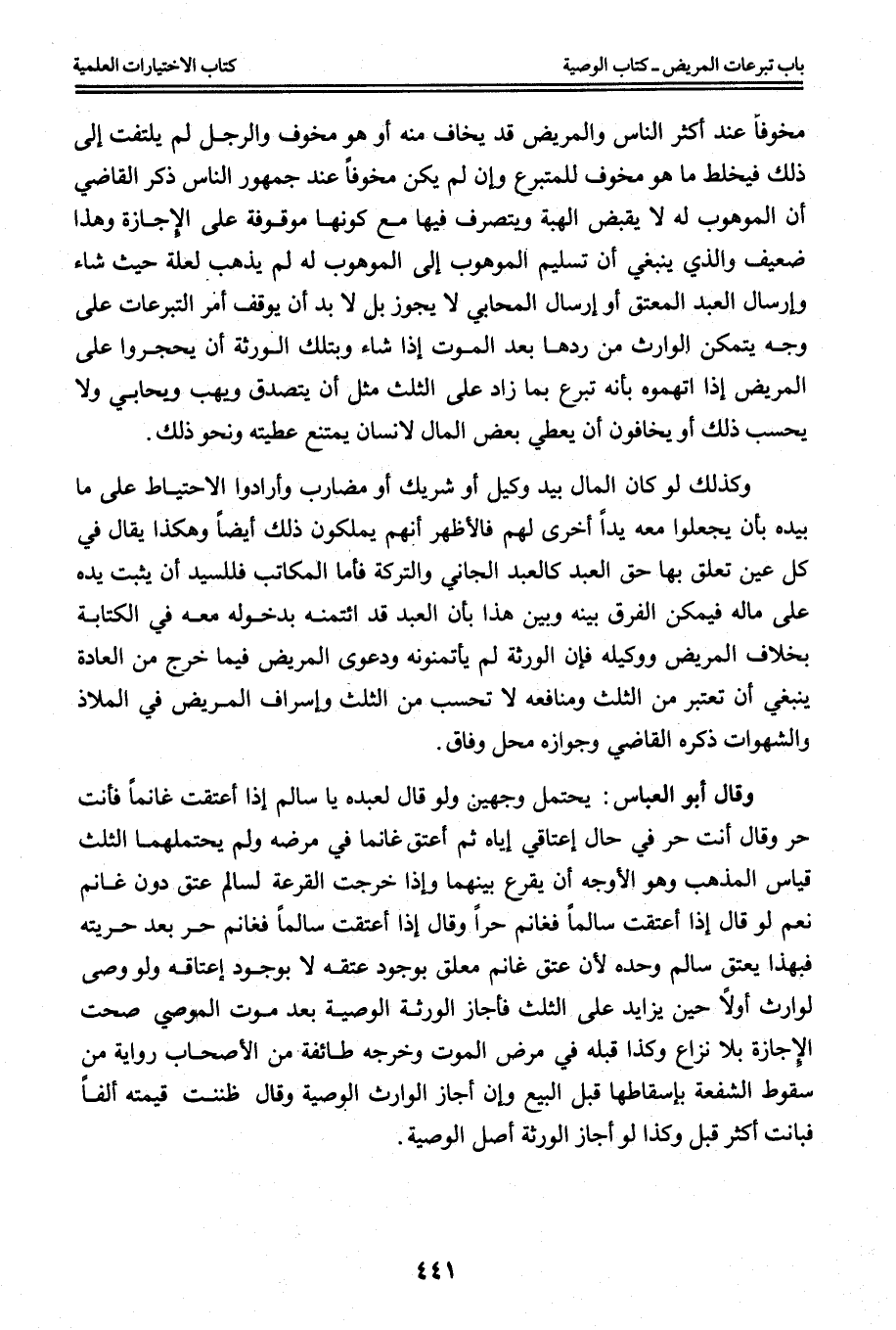 مَخُوفًا عِنْدَ أَكْثَرِ النَّاسِ وَالْمَرِيضُ قَدْ يَخَافُ مِنْهُ أَوْ هُوَ مَخُوفٌ وَالرَّجُلُ لَمْ يَلْتَفِتْ إلَى ذَلِكَ فَيُخْلَطُ مَا هُوَ مَخُوفٌ لِلْمُتَبَرِّعِ وَإِنْ لَمْ يَكُنْ مَخُوفًا عِنْدَ جُمْهُورِ النَّاسِ، ذَكَرَ الْقَاضِي أَنَّ الْمَوْهُوبَ لَهُ لَا يَقْبِضُ الْهِبَةَ وَيَتَصَرَّفُ فِيهَا مَعَ كَوْنِهَا مَوْقُوفَةً عَلَى الْإِجَازَةِ وَهَذَا ضَعِيفٌ وَاَلَّذِي يَنْبَغِي أَنَّ تَسْلِيمَ الْمَوْهُوبِ إلَى الْمَوْهُوبِ لَهُ لَمْ يَذْهَبْ لِعِلَّةٍ حَيْثُ شَاءَ. وَإِرْسَالُ الْعَبْدِ الْمُعْتَقِ أَوْ إرْسَالُ الْمُحَابِي لَا يَجُوزُ بَلْ لَا بُدَّ أَنْ يُوقَفَ أَمْرُ التَّبَرُّعَاتِ عَلَى وَجْهٍ يَتَمَكَّنُ الْوَارِثُ مِنْ رَدِّهَا بَعْدَ الْمَوْتِ إذَا شَاءَ وَلِتِلْكَ الْوَرَثَةِ أَنْ يَحْجُرُوا عَلَى الْمَرِيضِ إذَا اتَّهَمُوهُ بِأَنَّهُ تَبَرَّعَ بِمَا زَادَ عَلَى الثُّلُثِ مِثْلُ أَنْ يَتَصَدَّقَ وَيَهَبَ وَيُحَابِيَ وَلَا يَحْسِبُ ذَلِكَ أَوْ يَخَافُونَ أَنْ يُعْطِيَ بَعْضَ الْمَالِ لِإِنْسَانٍ يَمْتَنِعُ عَطِيَّتُهُ وَنَحْوُ ذَلِكَ.