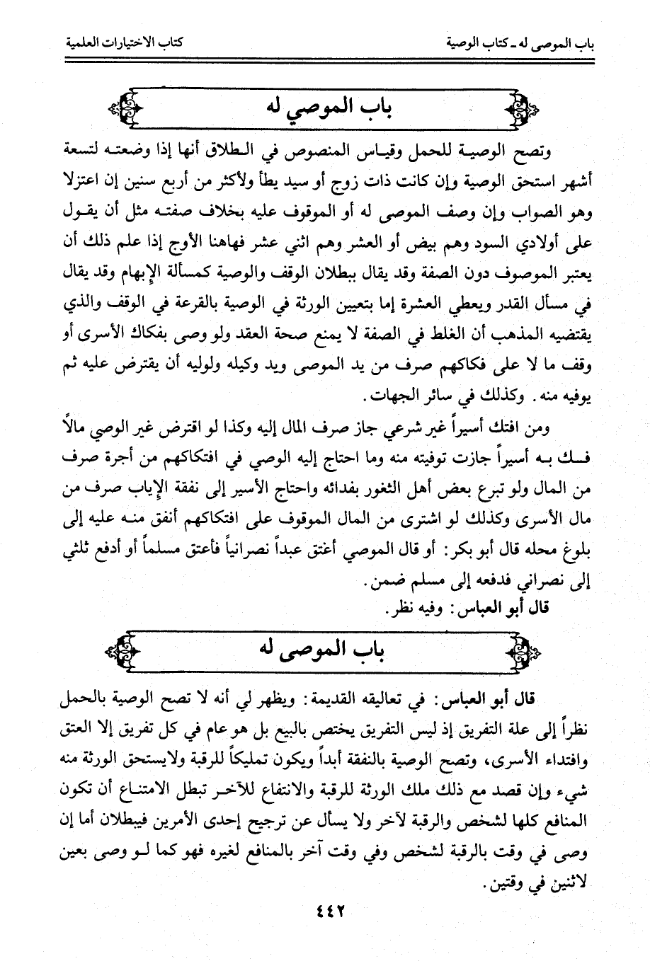 قَالَ أَبُو الْعَبَّاسِ: وَفِيهِ نَظَرٌ. بَابُ الْمُوصَى بِهِ قَالَ أَبُو الْعَبَّاسِ: فِي تَعَالِيقِهِ الْقَدِيمَةِ: وَيَظْهَرُ لِي أَنَّهُ لَا تَصِحُّ الْوَصِيَّةُ بِالْحَمْلِ نَظَرًا إلَى عِلَّةِ التَّفْرِيقِ إذْ لَيْسَ التَّفْرِيقُ يَخْتَصُّ بِالْبَيْعِ بَلْ هُوَ عَامٌّ فِي كُلِّ تَفْرِيقٍ إلَّا الْعِتْقَ وَافْتِدَاءَ الْأَسْرَى، وَتَصِحُّ الْوَصِيَّةُ بِالنَّفَقَةِ أَبَدًا وَيَكُونُ تَمْلِيكًا لِلرَّقَبَةِ وَلَا يَسْتَحِقُّ الْوَرَثَةُ مِنْهُ شَيْئًا وَإِنْ قَصَدَ مَعَ ذَلِكَ مِلْكَ الْوَرَثَةِ لِلرَّقَبَةِ وَالِانْتِفَاعَ لِلْآخَرِ تَبْطُلْ لِامْتِنَاعِ أَنْ تَكُونَ الْمَنَافِعُ كُلُّهَا لِشَخْصٍ، وَالرَّقَبَةُ لِآخَرَ وَلَا يَسْأَلُ عَنْ تَرْجِيحِ إحْدَى الْأَمْرَيْنِ فَيَبْطُلَانِ أَمَّا إنْ وَصَّى فِي وَقْتٍ بِالرَّقَبَةِ لِشَخْصٍ وَفِي وَقْتٍ آخَرَ بِالْمَنَافِعِ لِغَيْرِهِ فَهُوَ كَمَا لَوْ وَصَّى بِعَيْنٍ لِاثْنَيْنِ فِي وَقْتَيْنِ.