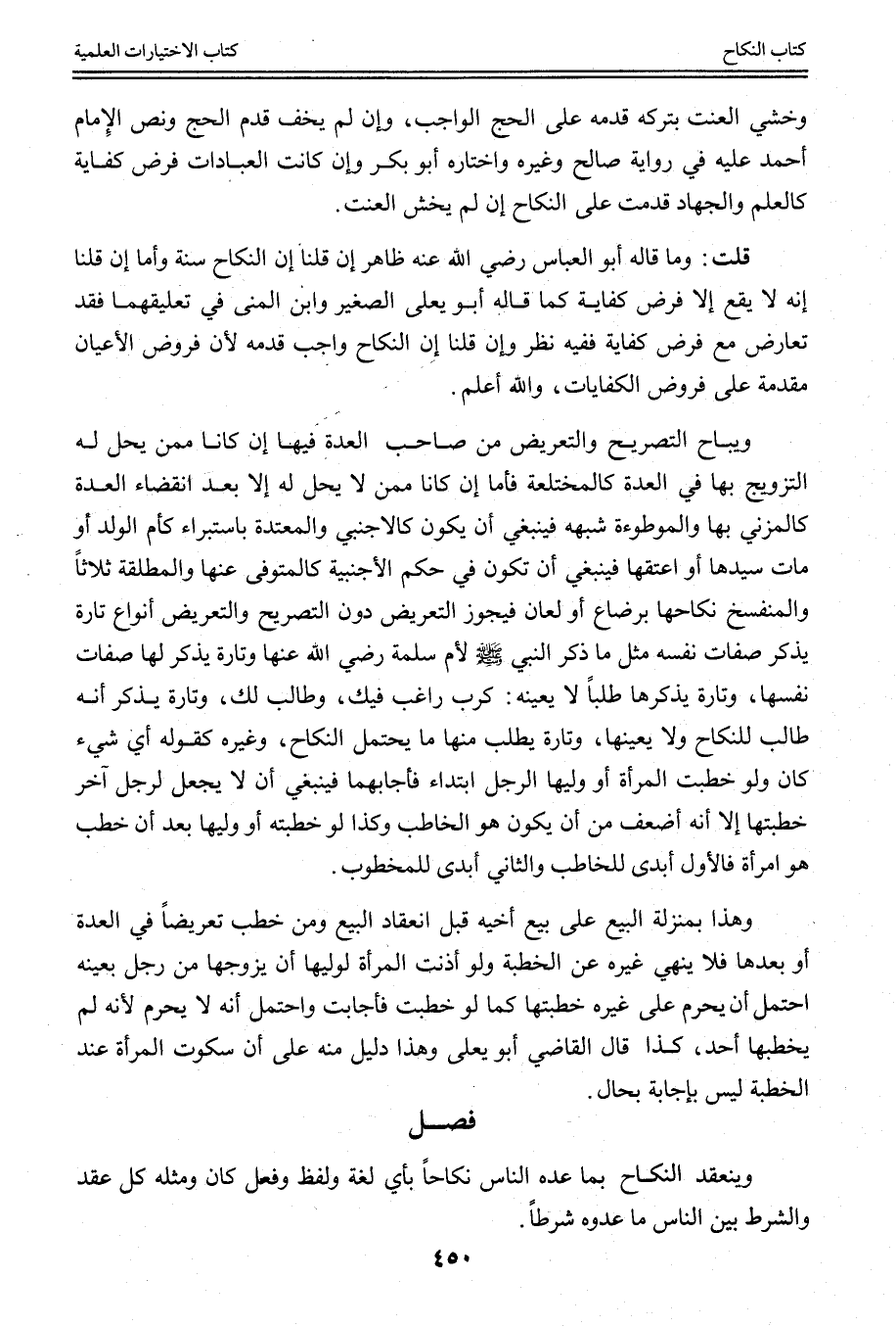 وَخَشِيَ الْعَنَتَ بِتَرْكِهِ قَدَّمَهُ عَلَى الْحَجِّ الْوَاجِبِ، وَإِنْ لَمْ يَخَفْ قَدَّمَ الْحَجَّ وَنَصَّ الْإِمَامُ أَحْمَدُ عَلَيْهِ فِي رِوَايَةِ صَالِحٍ وَغَيْرِهِ وَاخْتَارَهُ أَبُو بَكْرٍ وَإِنْ كَانَتْ الْعِبَادَاتُ فَرْضَ كِفَايَةٍ كَالْعِلْمِ وَالْجِهَادِ قُدِّمَتْ عَلَى النِّكَاحِ إنْ لَمْ يَخْشَ الْعَنَتَ. قُلْت: وَمَا قَالَهُ أَبُو الْعَبَّاسِ - رَضِيَ اللَّهُ عَنْهُ - ظَاهِرٌ إنْ قُلْنَا: إنَّ النِّكَاحَ سُنَّةٌ وَأَمَّا إنْ قُلْنَا: إنَّهُ لَا يَقَعُ إلَّا فَرْضَ كِفَايَةٍ كَمَا قَالَهُ أَبُو يَعْلَى الصَّغِيرُ وَابْنُ الْمُنَى فِي تَعْلِيقِهِمَا فَقَدْ تَعَارَضَ مَعَ فَرْضِ كِفَايَةٍ فَفِيهِ نَظَرٌ وَإِنْ قُلْنَا: إنَّ النِّكَاحَ وَاجِبٌ قَدَّمَهُ لِأَنَّ فُرُوضَ الْأَعْيَانِ مُقَدَّمَةٌ عَلَى فُرُوضِ الْكِفَايَاتِ، وَاَللَّهُ أَعْلَمُ.