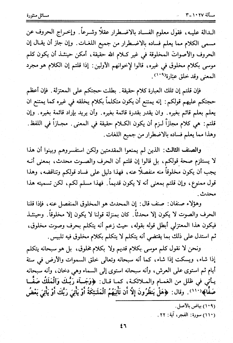 وَحِينَئِذٍ فَيَكُونُ هَذَا الْمُعْتَزِلِيُّ أَبْطَلَ قَوْلَهُ بِقَوْلِهِ، حَيْثُ زَعَمَ أَنَّهُ يَتَكَلَّمُ بِحَرْفٍ وَصَوْتٍ مَخْلُوقٍ، ثُمَّ اسْتَدَلَّ عَلَى ذَلِكَ بِمَا يَقْتَضِي أَنَّهُ يَتَكَلَّمُ لَا يَتَكَلَّمُ بِكَلَامٍ مَخْلُوقٍ فِيهِ تَلْبِيسٌ.