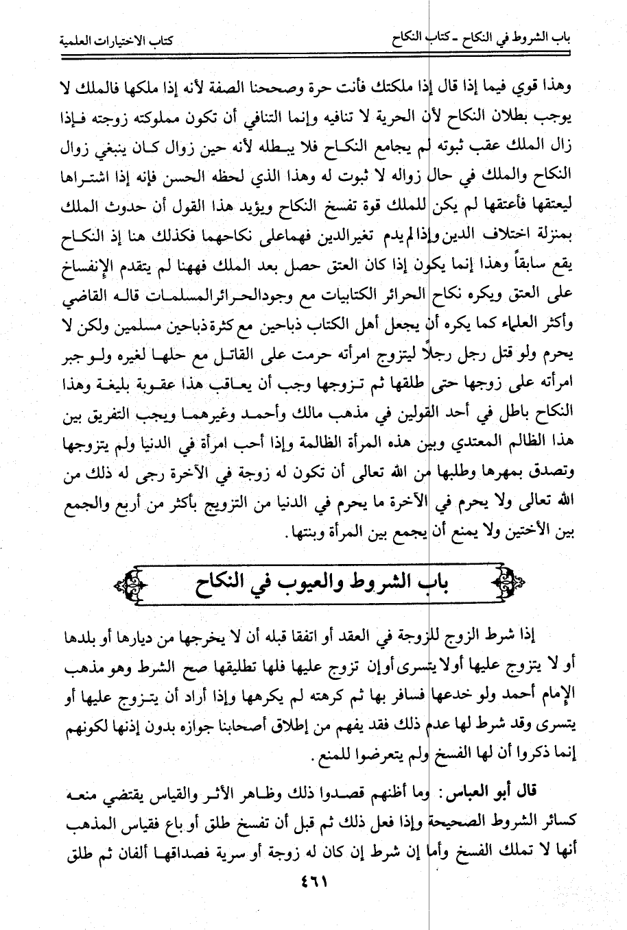 ِ إذَا شَرَطَ الزَّوْجُ لِلزَّوْجَةِ فِي الْعَقْدِ أَوْ اتَّفَقَا قَبْلَهُ أَنْ لَا يُخْرِجَهَا مِنْ دِيَارِهَا أَوْ بَلَدِهَا أَوْ لَا يَتَزَوَّجَ عَلَيْهَا أَوْ لَا يَتَسَرَّى أَوْ إنْ تَزَوَّجَ عَلَيْهَا فَلَهَا تَطْلِيقُهَا صَحَّ الشَّرْطُ وَهُوَ مَذْهَبُ الْإِمَامِ أَحْمَدَ وَلَوْ خَدَعَهَا فَسَافَرَ بِهَا ثُمَّ كَرِهَتْهُ لَمْ يُكْرِهْهَا وَإِذَا أَرَادَ أَنْ يَتَزَوَّجَ عَلَيْهَا أَوْ يَتَسَرَّى وَقَدْ شَرَطَ لَهَا عَدَمَ ذَلِكَ فَقَدْ يُفْهَمُ مِنْ إطْلَاقِ أَصْحَابِنَا جَوَازُهُ بِدُونِ إذْنِهَا لِكَوْنِهِمْ إنَّمَا ذَكَرُوا أَنَّ لَهَا الْفَسْخَ وَلَمْ يَتَعَرَّضُوا لِلْمَنْعِ. قَالَ أَبُو الْعَبَّاسِ: وَمَا أَظُنُّهُمْ قَصَدُوا ذَلِكَ، وَظَاهِرُ الْأَثَرِ وَالْقِيَاسُ يَقْتَضِي مَنْعَهُ كَسَائِرِ الشُّرُوطِ الصَّحِيحَةِ وَإِذَا فَعَلَ ذَلِكَ ثُمَّ قَبْلَ أَنْ تَفْسَخَ طَلَّقَ أَوْ بَاعَ فَقِيَاسُ الْمَذْهَبِ أَنَّهَا لَا تَمْلِكُ الْفَسْخَ وَأَمَّا إنْ شَرَطَ إنْ كَانَ لَهُ زَوْجَةٌ أَوْ سُرِّيَّةٌ فَصَدَاقُهَا أَلْفَانِ ثُمَّ طَلَّقَ