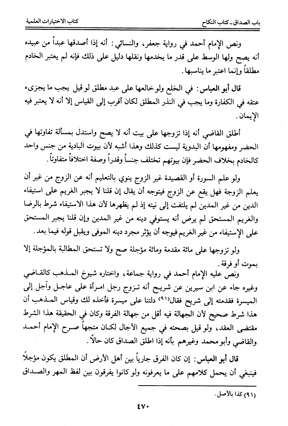 وَنَصَّ الْإِمَامُ أَحْمَدُ فِي رِوَايَةِ جَعْفَرٍ، وَالنَّسَائِيُّ: أَنَّهُ إذَا أَصْدَقَهَا عَبْدًا مِنْ عَبِيدِهِ أَنَّهُ يَصِحُّ وَلَهَا الْوَسَطُ عَلَى قَدْرِ مَا يَخْدُمُهَا وَنَقْلُهَا دَلِيلٌ عَلَى ذَلِكَ فَإِنَّهُ لَمْ يَعْتَبِرْ الْخَادِمَ مُطْلَقًا وَإِنَّمَا اعْتَبَرَ مَا يُنَاسِبُهَا. قَالَ أَبُو الْعَبَّاسِ: فِي الْخُلْعِ وَلَوْ خَالَعَهَا عَلَى عَبْدٍ مُطْلَقٍ لَوْ قِيلَ يَجِبُ مَا يُجْزِئُ عِتْقُهُ فِي الْكَفَّارَةِ وَمَا يَجِبُ فِي النَّذْرِ الْمُطْلَقِ لَكَانَ أَقْرَبَ إلَى الْقِيَاسِ إلَّا أَنَّهُ لَا يُعْتَبَرُ فِيهِ الْإِيمَانُ.
