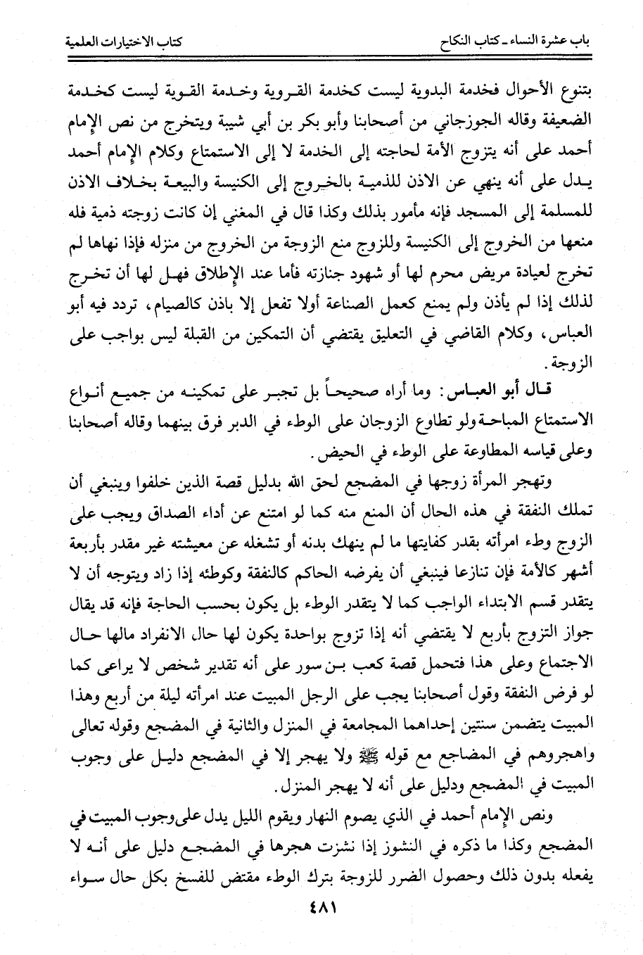 وَنَصُّ الْإِمَامِ أَحْمَدَ فِي الَّذِي يَصُومُ النَّهَارَ وَيَقُومُ اللَّيْلَ يَدُلُّ عَلَى وُجُوبِ الْمَبِيتِ فِي الْمَضْجَعِ وَكَذَا مَا ذَكَرَهُ فِي النُّشُوزِ إذَا نَشَزَتْ هَجَرَهَا فِي الْمَضْجَعِ دَلِيلٌ عَلَى أَنَّهُ لَا يَفْعَلُهُ بِدُونِ ذَلِكَ وَحُصُولُ الضَّرَرِ لِلزَّوْجَةِ بِتَرْكِ الْوَطْءِ مُقْتَضٍ لِلْفَسْخِ بِكُلِّ حَالٍ سَوَاءٌ