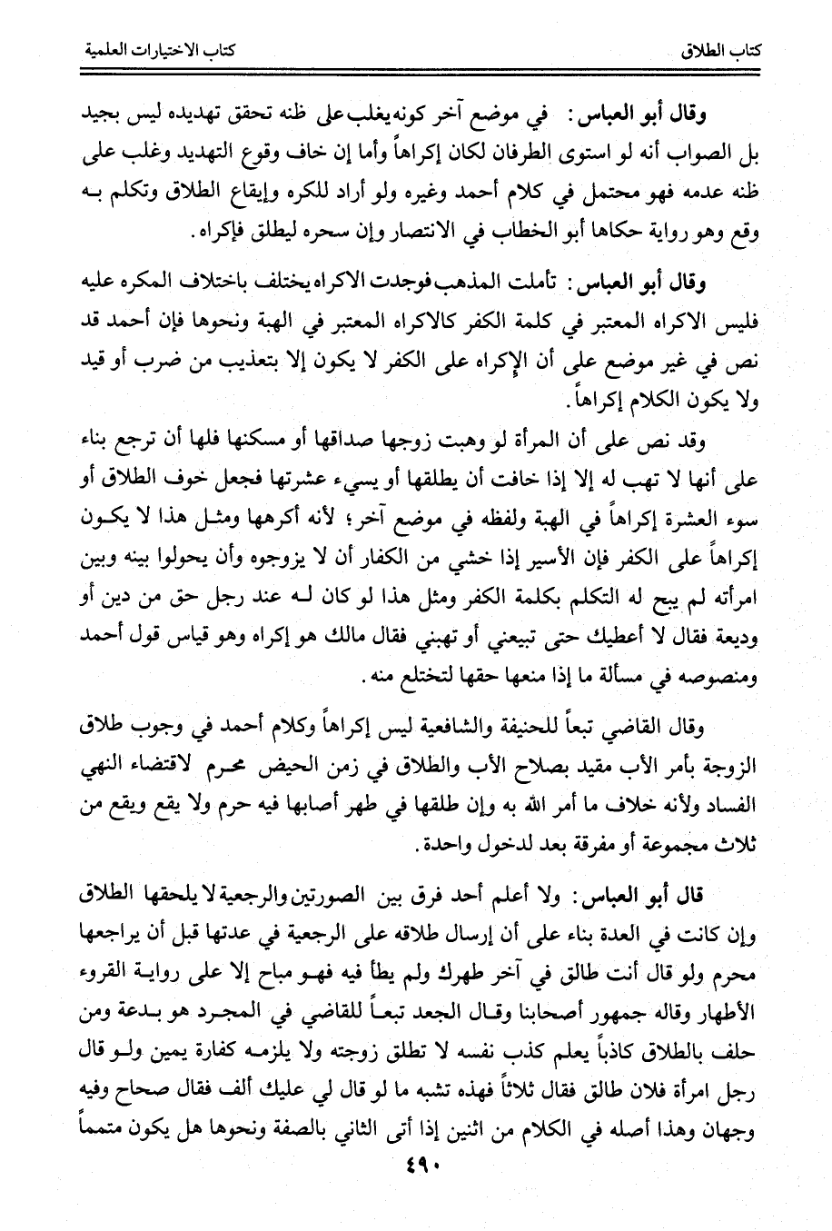 وَقَالَ أَبُو الْعَبَّاسِ: تَأَمَّلْت الْمَذْهَبَ فَوَجَدْت الْإِكْرَاهَ يَخْتَلِفُ بِاخْتِلَافِ الْمُكْرَهِ عَلَيْهِ فَلَيْسَ الْإِكْرَاهُ الْمُعْتَبَرُ فِي كَلِمَةِ الْكُفْرِ كَالْإِكْرَاهِ الْمُعْتَبَرِ فِي الْهِبَةِ وَنَحْوِهَا فَإِنَّ أَحْمَدَ قَدْ نَصَّ فِي غَيْرِ مَوْضِعٍ عَلَى أَنَّ الْإِكْرَاهَ عَلَى الْكُفْرِ لَا يَكُونُ إلَّا بِتَعْذِيبٍ مِنْ ضَرْبٍ أَوْ قَيْدٍ وَلَا يَكُونُ الْكَلَامُ إكْرَاهًا.