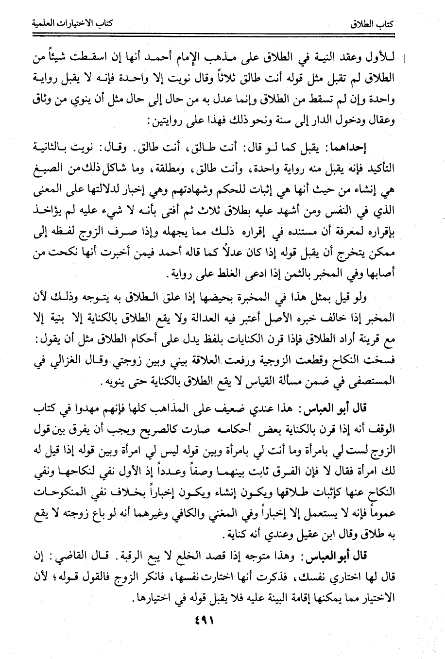 وَلَا يَقَعُ الطَّلَاقُ بِالْكِنَايَةِ إلَّا بِنِيَّةٍ إلَّا مَعَ قَرِينَةِ إرَادَةِ الطَّلَاقِ فَإِذَا قَرَنَ الْكِنَايَاتِ بِلَفْظٍ يَدُلُّ عَلَى أَحْكَامِ الطَّلَاقِ مِثْلُ أَنْ يَقُولَ: فَسَخْت النِّكَاحَ وَقَطَعْت الزَّوْجِيَّةَ وَرَفَعْت الْعَلَاقَةَ بَيْنِي وَبَيْنَ زَوْجَتِي وَقَالَ الْغَزَالِيُّ فِي الْمُسْتَصْفَى فِي ضِمْنِ مَسْأَلَةِ الْقِيَاسِ يَقَعُ الطَّلَاقُ بِالْكِنَايَةِ حَتَّى يَنْوِيَهُ. قَالَ أَبُو الْعَبَّاسِ: هَذَا عِنْدِي ضَعِيفٌ عَلَى الْمَذَاهِبِ كُلِّهَا فَإِنَّهُمْ مَهَّدُوا فِي كِتَابِ الْوَقْفِ أَنَّهُ إذَا قَرَنَ بِالْكِنَايَةِ بَعْضَ أَحْكَامِهِ صَارَتْ كَالصَّرِيحِ وَيَجِبُ أَنْ يُفَرَّقَ بَيْنَ قَوْلِ الزَّوْجِ لَسْت لِي بِامْرَأَةٍ وَمَا أَنْت لِي بِامْرَأَةٍ وَبَيْنَ قَوْلِهِ لَيْسَ لِي امْرَأَةٌ وَبَيْنَ قَوْلِهِ إذَا قِيلَ لَهُ لَك امْرَأَةٌ فَقَالَ لَا فَإِنَّ الْفَرْقَ ثَابِتٌ بَيْنَهُمَا وَصْفًا وَعَدَدًا إذْ الْأَوَّلُ نَفْيٌ لِنِكَاحِهَا وَنَفْيُ النِّكَاحِ عَنْهَا كَإِثْبَاتِ طَلَاقِهَا وَيَكُونُ إنْشَاءً وَيَكُونُ إخْبَارًا بِخِلَافِ نَفْيِ الْمَنْكُوحَاتِ عُمُومًا فَإِنَّهُ لَا يَسْتَعْمِل إلَّا إخْبَارًا وَفِي الْمُغْنِي وَالْكَافِي وَغَيْرِهِمَا أَنَّهُ لَوْ بَاعَ زَوْجَتَهُ لَا يَقَعُ بِهِ طَلَاقٌ وَقَالَ ابْنُ عَقِيلٍ وَعِنْدِي أَنَّهُ كِنَايَةٌ. قَالَ أَبُو الْعَبَّاسِ: وَهَذَا مُتَوَجِّهٌ إذَا قَصَدَ الْخُلْعَ لَا بَيْعَ الرَّقَبَةِ. قَالَ الْقَاضِي: إنْ قَالَ لَهَا: اخْتَارِي نَفْسَكِ، فَذَكَرَتْ أَنَّهَا اخْتَارَتْ نَفْسَهَا، فَأَنْكَرَ الزَّوْجُ فَالْقَوْلُ قَوْلُهُ؛ لِأَنَّ الِاخْتِيَارَ مِمَّا يُمْكِنُهَا إقَامَةُ الْبَيِّنَةِ عَلَيْهِ فَلَا يُقْبَلُ قَوْلُهُ فِي اخْتِيَارِهَا.