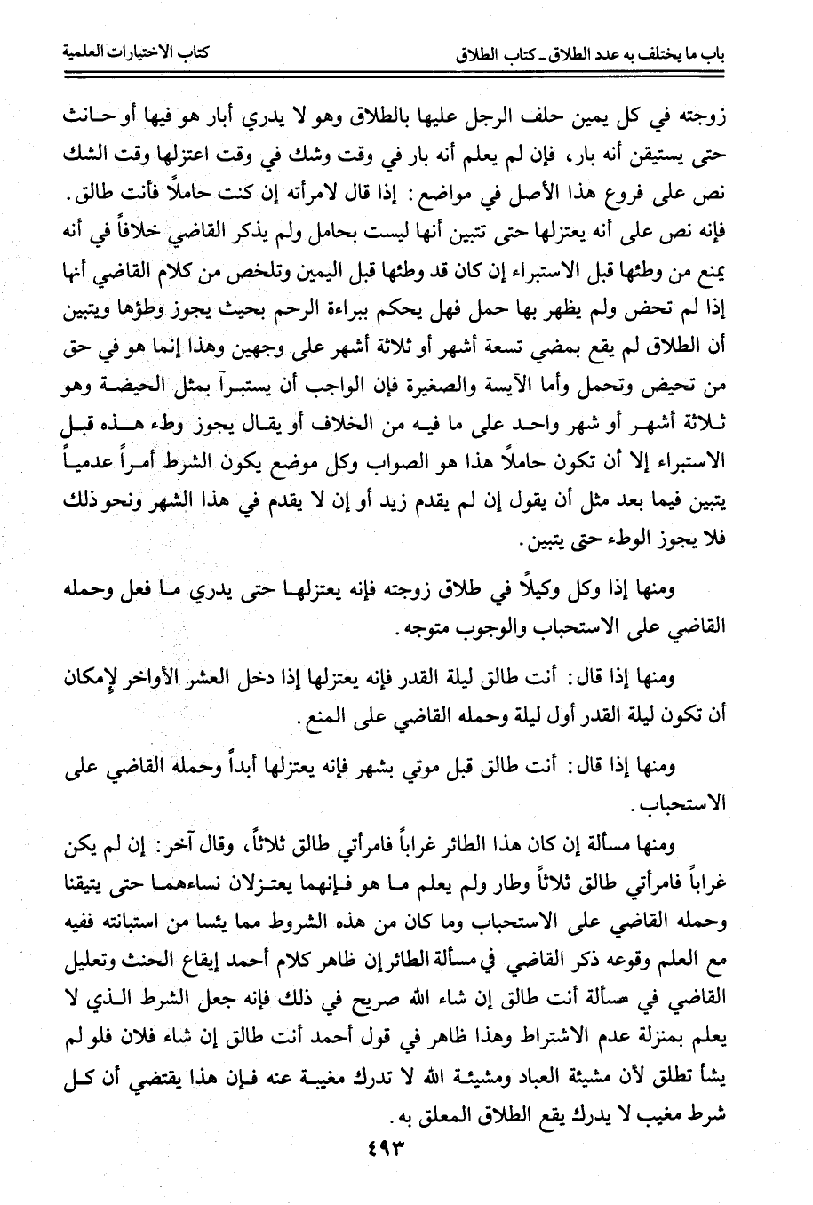 زَوْجَتَهُ فِي كُلِّ يَمِينٍ حَلَفَ الرَّجُلُ عَلَيْهَا بِالطَّلَاقِ وَهُوَ لَا يَدْرِي أَبَارٌّ هُوَ فِيهَا أَوْ حَانِثٌ حَتَّى يَسْتَيْقِنَ أَنَّهُ بَارٌّ، فَإِنْ لَمْ يَعْلَمْ أَنَّهُ بَارٌّ فِي وَقْتٍ وَشَكَّ فِي وَقْتٍ اعْتَزَلَهَا وَقْتَ الشَّكِّ نَصَّ عَلَى فُرُوعِ هَذَا الْأَصْلِ فِي مَوَاضِعَ: إذَا قَالَ لِامْرَأَتِهِ إنْ كُنْت حَامِلًا فَأَنْتَ طَالِقٌ.