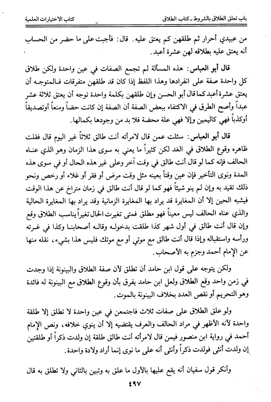 مِنْ عَبِيدِي أَحْرَارٌ ثُمَّ طَلَّقَهُنَّ كَمْ يَعْتِقُ عَلَيْهِ. قَالَ: فَأَجَبْت عَلَى مَا حَضَرَ مِنْ الْحِسَابِ أَنَّهُ يَعْتِقُ عَلَيْهِ بِطَلَاقِهِ لَهُنَّ عَشَرَةُ أَعْبُدٍ. قَالَ أَبُو الْعَبَّاسِ: هَذِهِ الْمَسْأَلَةُ لَمْ تَجْمَعْ الصِّفَاتِ فِي عَيْنٍ وَاحِدَةٍ وَلَكِنَّ طَلَاقَ كُلِّ وَاحِدَةٍ صِفَةٌ عَلَى انْفِرَادِهَا وَهَذَا اللَّفْظُ إذَا كَانَ قَدْ طَلَّقَهُنَّ مُتَفَرِّقَاتٍ فَالْمُتَوَجَّهُ أَنْ يَعْتِقَ عَشَرَةَ أَعْبُدٍ كَمَا قَالَ أَبُو الْحَسَنِ وَإِنْ طَلَّقَهُنَّ بِكَلِمَةٍ وَاحِدَةٍ تَوَجَّهَ أَنْ يَعْتِقَ ثَلَاثَةَ عَشَرَ عَبْدًا وَأَصَحُّ الطُّرُقِ فِي الِاكْتِفَاءِ بِبَعْضِ الصِّفَةِ أَنَّ الصِّفَةَ إنْ كَانَتْ حَضًّا وَمَنْعًا أَوْ تَصْدِيقًا أَوْ كَذِبًا فَهِيَ كَالْيَمِينِ وَإِلَّا فَهِيَ عِلَّةٌ مَحْضَةٌ فَلَا بُدَّ مِنْ وُجُودِهَا بِكَمَالِهَا.