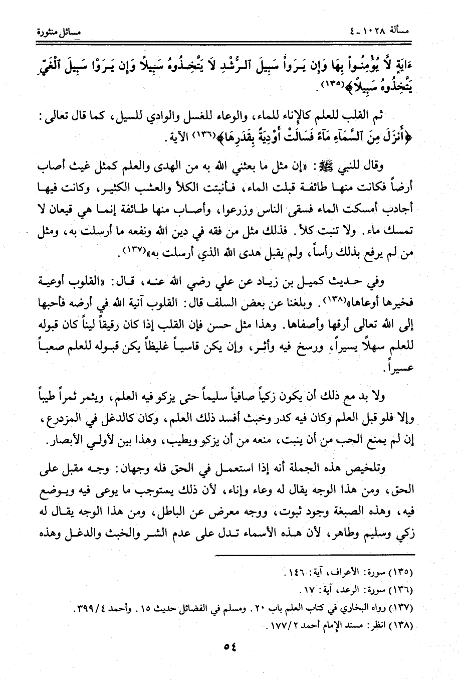 ثُمَّ الْقَلْبُ لِلْعِلْمِ كَالْإِنَاءِ لِلْمَاءِ، وَالْوِعَاءِ لِلْغُسْلِ وَالْوَادِي لِلسَّيْلِ، كَمَا قَالَ تَعَالَى: {أَنْزَلَ مِنَ السَّمَاءِ مَاءً فَسَالَتْ أَوْدِيَةٌ بِقَدَرِهَا} [الرعد: 17] الْآيَةَ.