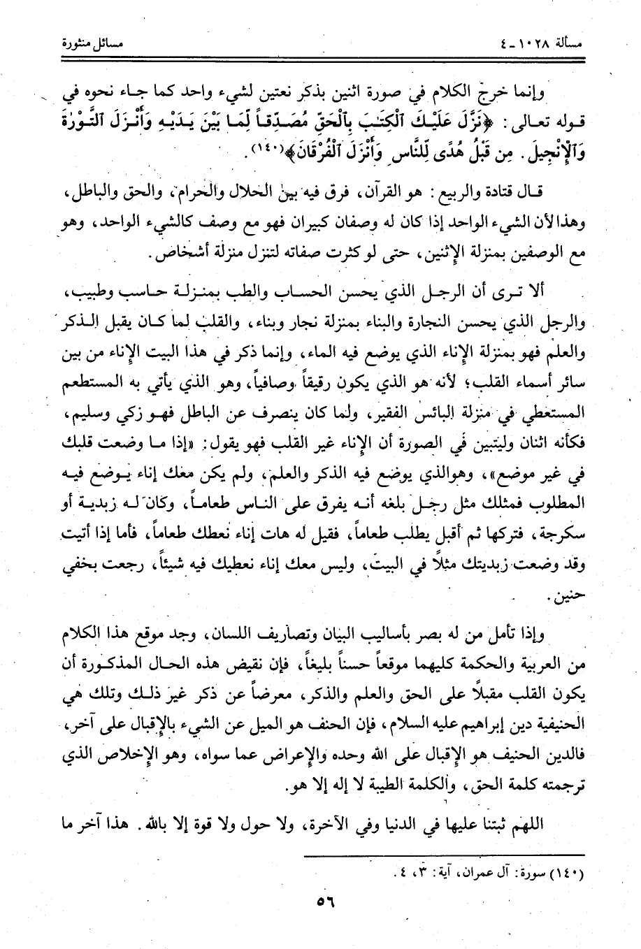 وَإِذَا تَأَمَّلَ مَنْ لَهُ بَصَرٌ بِأَسَالِيبِ الْبَيَانِ وَتَصَارِيفِ اللِّسَانِ، وَجَدَ مَوْقِعَ هَذَا الْكَلَامِ مِنْ الْعَرَبِيَّةِ وَالْحِكْمَةِ كِلَيْهِمَا مَوْقِعًا حَسَنًا بَلِيغًا، فَإِنَّ نَقِيضَ هَذِهِ الْحَالِ الْمَذْكُورَةِ أَنْ يَكُونَ الْقَلْبُ مُقْبِلًا عَلَى الْحَقِّ وَالْعِلْمِ وَالذِّكْرِ، مُعْرِضًا عَنْ ذِكْرِ غَيْرِ ذَلِكَ وَتِلْكَ هِيَ الْحَنِيفِيَّةُ دِينُ إبْرَاهِيمَ - عَلَيْهِ السَّلَامُ -، فَإِنَّ الْحَنَفَ هُوَ الْمَيْلُ عَنْ الشَّيْءِ بِالْإِقْبَالِ عَلَى آخَرَ، فَالدِّينُ الْحَنِيفُ هُوَ الْإِقْبَالُ عَلَى اللَّهِ وَحْدَهُ وَالْإِعْرَاضُ عَمَّا سِوَاهُ، وَهُوَ الْإِخْلَاصُ الَّذِي تَرْجَمَته كَلِمَةُ الْحَقِّ، وَالْكَلِمَةُ الطَّيِّبَةُ لَا إلَهَ إلَّا هُوَ.
