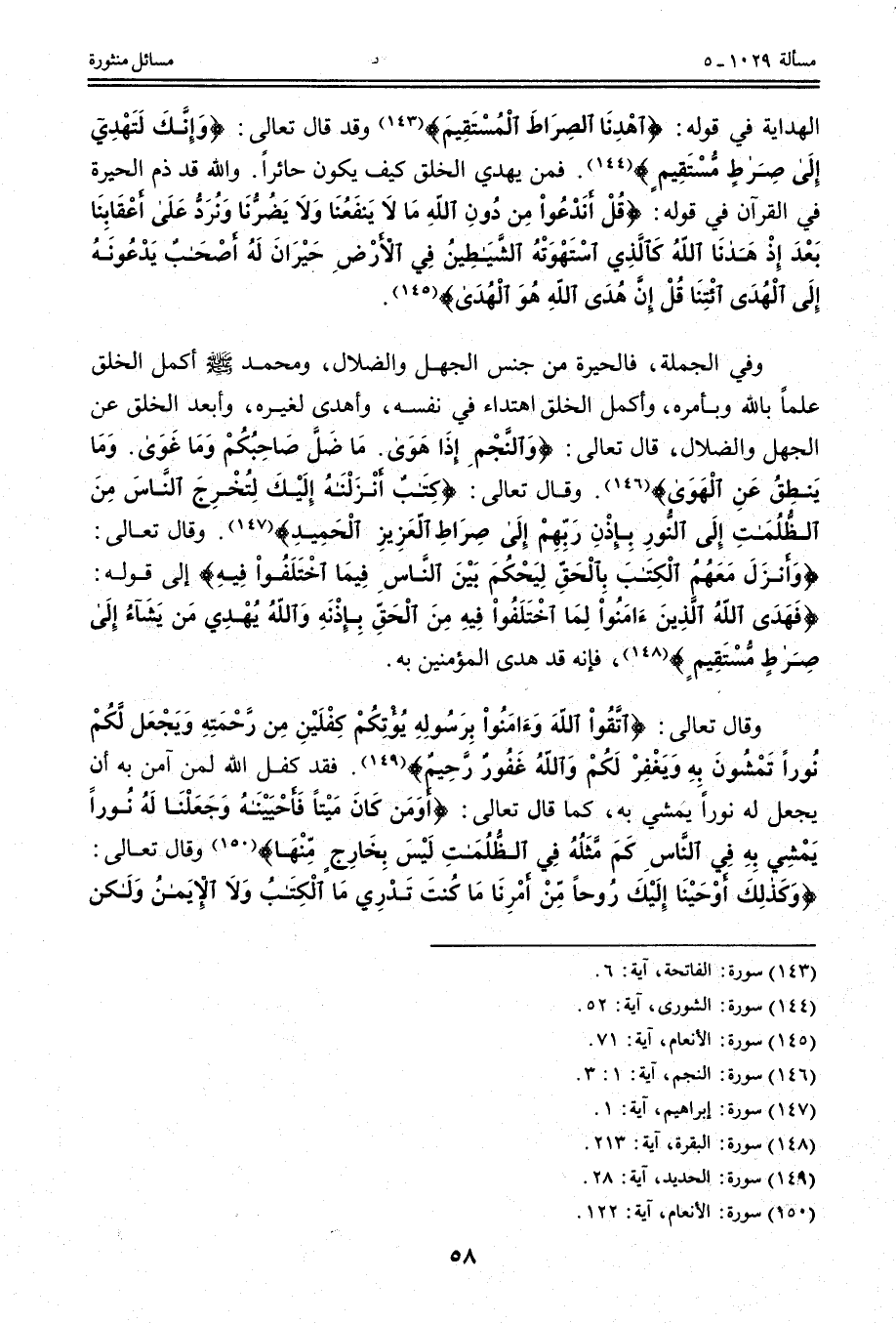 وَفِي الْجُمْلَةِ، فَالْحِيرَةُ مِنْ جِنْسِ الْجَهْلِ وَالضَّلَالِ، وَمُحَمَّدٌ - صَلَّى اللَّهُ عَلَيْهِ وَسَلَّمَ - أَكْمَلُ الْخَلْقِ عِلْمًا بِاَللَّهِ وَبِأَمْرِهِ، وَأَكْمَلُ الْخَلْقِ اهْتِدَاءً فِي نَفْسِهِ، وَأَهْدَى لِغَيْرِهِ، وَأَبْعَدُ الْخَلْقِ عَنْ الْجَهْلِ وَالضَّلَالِ، قَالَ تَعَالَى: {وَالنَّجْمِ إِذَا هَوَى} [النجم: 1] {مَا ضَلَّ صَاحِبُكُمْ وَمَا غَوَى} [النجم: 2] {وَمَا يَنْطِقُ عَنِ الْهَوَى} [النجم: 3] .