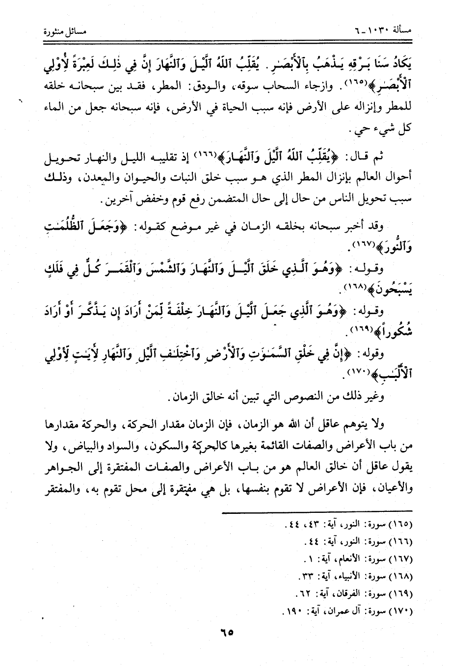 وَغَيْرِ ذَلِكَ مِنْ النُّصُوصِ الَّتِي تُبَيِّنُ أَنَّهُ خَالِقُ الزَّمَانِ. وَلَا يَتَوَهَّمُ عَاقِلٌ أَنَّ اللَّهَ هُوَ الزَّمَانُ، فَإِنَّ الزَّمَانَ مِقْدَارُ الْحَرَكَةِ، وَالْحَرَكَةُ مِقْدَارُهَا مِنْ بَابِ الْأَعْرَاضِ وَالصِّفَاتِ الْقَائِمَةِ بِغَيْرِهَا كَالْحَرَكَةِ وَالسُّكُونِ، وَالسَّوَادِ وَالْبَيَاضِ، وَلَا يَقُولُ عَاقِلٌ إنَّ خَالِقَ الْعَالَمِ هُوَ مِنْ بَابِ الْأَعْرَاضِ وَالصِّفَاتِ الْمُفْتَقِرَةِ إلَى الْجَوَاهِرِ وَالْأَعْيَانِ فَإِنَّ الْأَعْرَاضَ لَا تَقُومُ بِنَفْسِهَا، بَلْ هِيَ مُفْتَقِرَةٌ إلَى مَحَلٍّ تَقُومُ بِهِ، وَالْمُفْتَقِرُ