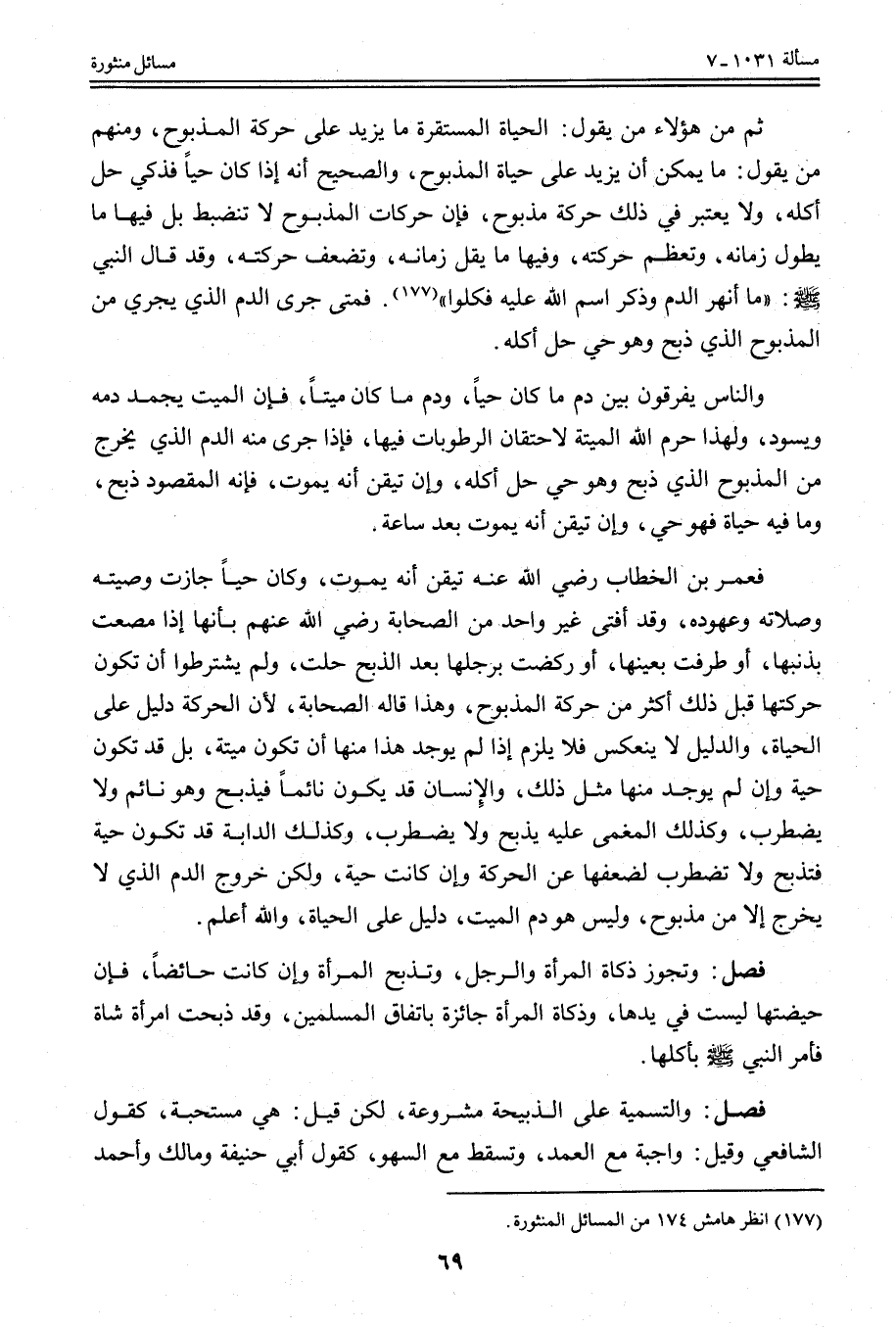 فَعُمَرُ بْنُ الْخَطَّابِ - رَضِيَ اللَّهُ عَنْهُ - تَيَقَّنَ أَنَّهُ يَمُوتُ، وَكَانَ حَيًّا جَازَتْ وَصِيَّتُهُ وَصَلَاتُهُ وَعُهُودُهُ، وَقَدْ أَفْتَى غَيْرُ وَاحِدٍ مِنْ الصَّحَابَةِ - رَضِيَ اللَّهُ عَنْهُمْ - بِأَنَّهَا إذَا مَصَعَتْ بِذَنَبِهَا، أَوْ طَرَفَتْ بِعَيْنِهَا، أَوْ رَكَضَتْ بِرِجْلِهَا بَعْدَ الذَّبْحِ حَلَّتْ، وَلَمْ يَشْتَرِطُوا أَنْ تَكُونَ حَرَكَتُهَا قَبْلَ ذَلِكَ أَكْثَرَ مِنْ حَرَكَةِ الْمَذْبُوحِ، وَهَذَا قَالَهُ الصَّحَابَةُ، لِأَنَّ الْحَرَكَةَ دَلِيلٌ عَلَى الْحَيَاةِ، وَالدَّلِيلُ لَا يَنْعَكِسُ فَلَا يَلْزَمُ إذَا لَمْ يُوجَدْ هَذَا مِنْهَا أَنْ تَكُونَ مَيْتَةً، بَلْ قَدْ تَكُونُ حَيَّةً وَإِنْ لَمْ يُوجَدْ مِنْهَا مِثْلُ ذَلِكَ، وَالْإِنْسَانُ قَدْ يَكُونُ نَائِمًا فَيُذْبَحُ وَهُوَ نَائِمٌ وَلَا يَضْطَرِبُ، وَكَذَلِكَ الْمُغْمَى عَلَيْهِ يُذْبَحُ وَلَا يَضْطَرِبُ، وَكَذَلِكَ الدَّابَّةُ قَدْ تَكُونُ حَيَّةً فَتُذْبَحُ وَلَا تَضْطَرِبُ لِضَعْفِهَا عَنْ الْحَرَكَةِ وَإِنْ كَانَتْ حَيَّةً، وَلَكِنَّ خُرُوجَ الدَّمِ الَّذِي لَا يَخْرُجُ إلَّا مِنْ مَذْبُوحٍ، وَلَيْسَ هُوَ دَمُ الْمَيِّتِ دَلِيلٌ عَلَى الْحَيَاةِ، وَاَللَّهُ أَعْلَمُ.