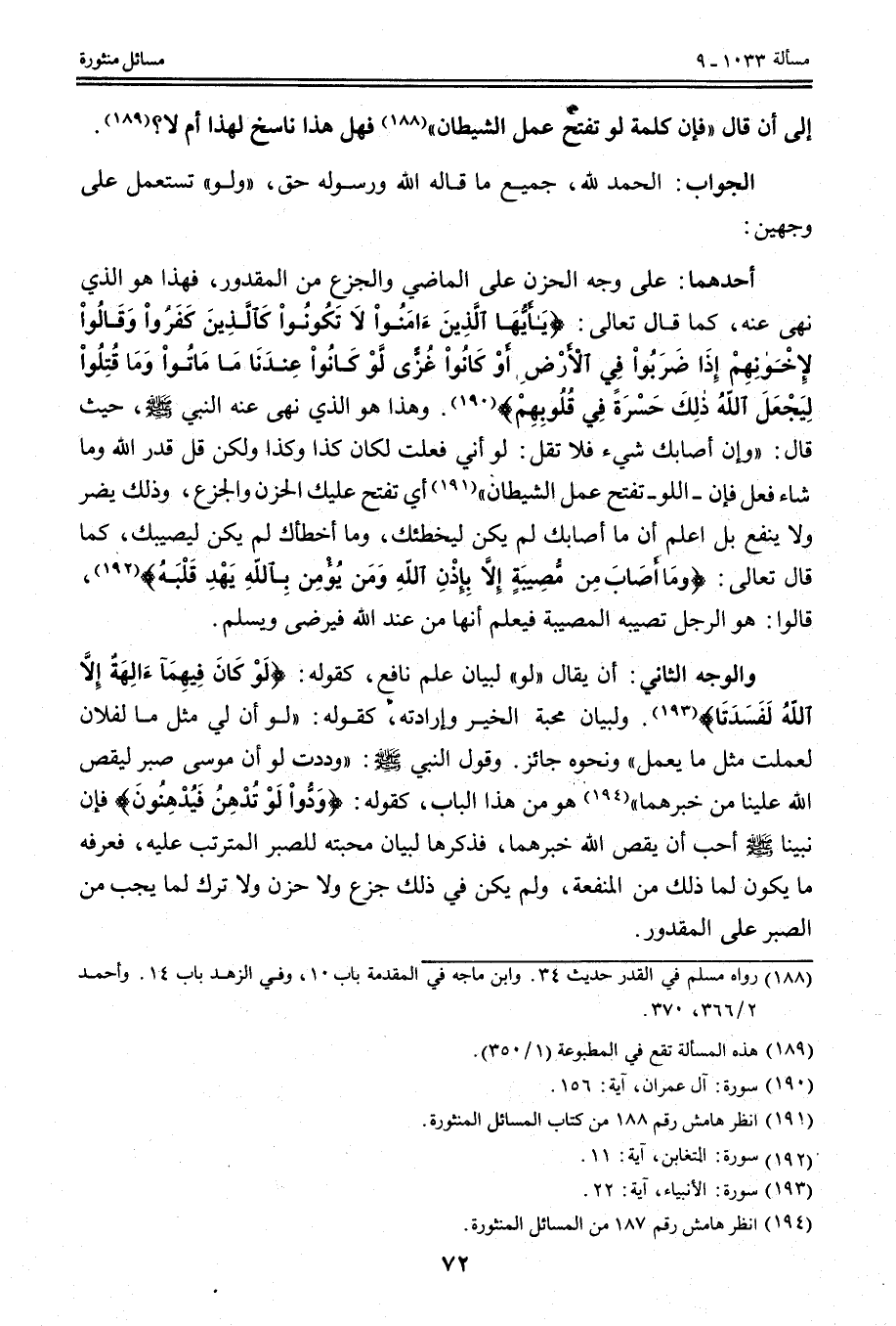 وَهَذَا هُوَ الَّذِي نَهَى عَنْهُ النَّبِيُّ - صَلَّى اللَّهُ عَلَيْهِ وَسَلَّمَ - حَيْثُ قَالَ: «وَإِنْ أَصَابَك شَيْءٌ فَلَا تَقُلْ: لَوْ أَنِّي فَعَلْت لَكَانَ كَذَا وَكَذَا وَلَكِنْ قُلْ قَدَّرَ اللَّهُ وَمَا شَاءَ فَعَلَ فَإِنَّ - اللَّوْ - تَفْتَحُ عَمَلَ الشَّيْطَانِ» أَيْ تَفْتَحُ عَلَيْك الْحُزْنَ وَالْجَزَعَ، وَذَلِكَ يَضُرُّ وَلَا يَنْفَعُ بَلْ اعْلَمْ أَنَّ مَا أَصَابَك لَمْ يَكُنْ لِيُخْطِئَك، وَمَا أَخْطَأَك لَمْ يَكُنْ لِيُصِيبَك، كَمَا قَالَ تَعَالَى: {مَا أَصَابَ مِنْ مُصِيبَةٍ إِلا بِإِذْنِ اللَّهِ وَمَنْ يُؤْمِنْ بِاللَّهِ يَهْدِ قَلْبَهُ} [التغابن: 11] ، قَالُوا: هُوَ الرَّجُلُ تُصِيبُهُ الْمُصِيبَةُ فَيَعْلَمُ أَنَّهَا مِنْ عِنْدِ اللَّهِ فَيَرْضَى وَيُسَلِّمُ.