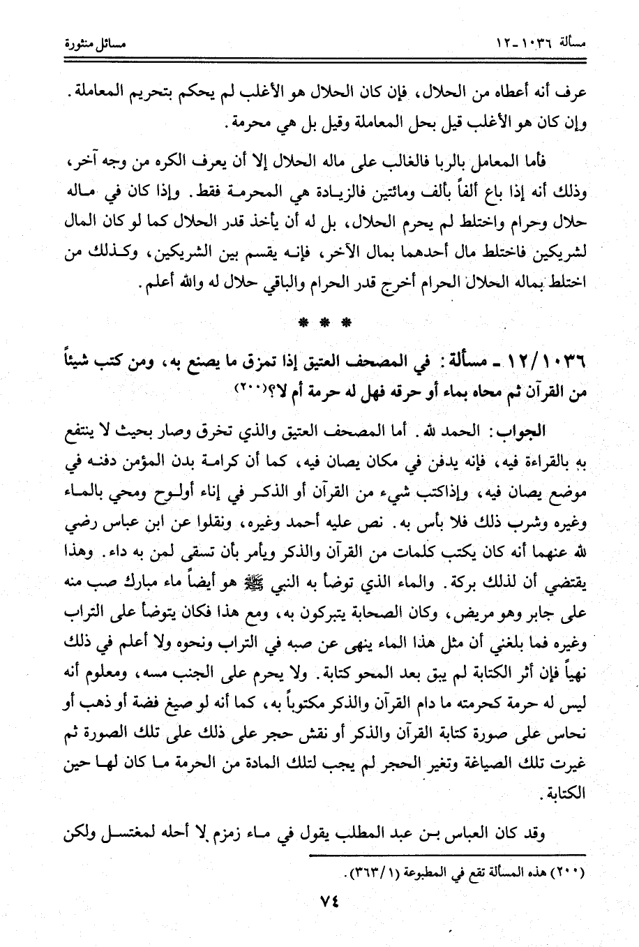 1036 - 12 مَسْأَلَةٌ: فِي الْمُصْحَفِ الْعَتِيقِ إذَا تَمَزَّقَ مَا يَصْنَعُ بِهِ، وَمَنْ كَتَبَ شَيْئًا مِنْ الْقُرْآنِ ثُمَّ مَحَاهُ بِمَاءٍ أَوْ حَرَّقَهُ فَهَلْ لَهُ حُرْمَةٌ أَمْ لَا؟
