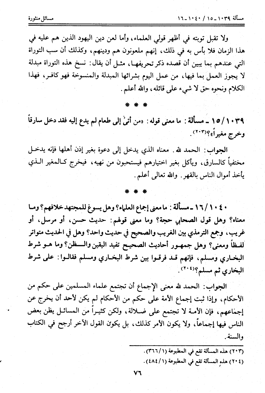 مَا مَعْنَى إجْمَاعِ الْعُلَمَاءِ؟ وَهَلْ يَسُوغُ لِلْمُجْتَهِدِ خِلَافُهُمْ؟ وَمَا مَعْنَاهُ؟ وَهَلْ قَوْلُ الصَّحَابِيِّ حُجَّةٌ؟ وَمَا مَعْنَى قَوْلِهِمْ: حَدِيثٌ حَسَنٌ، أَوْ مُرْسَلٌ، أَوْ غَرِيبٌ، وَجَمْعِ التِّرْمِذِيِّ بَيْنَ الْغَرِيبِ وَالصَّحِيحِ فِي حَدِيثٍ وَاحِدٍ؟ وَهَلْ فِي الْحَدِيثِ مُتَوَاتِرٌ لَفْظًا وَمَعْنًى؟ وَهَلْ جُمْهُورُ أَحَادِيثِ الصَّحِيحِ تُفِيدُ الْيَقِينَ وَالظَّنَّ؟ وَمَا هُوَ شَرْطُ الْبُخَارِيِّ وَمُسْلِمٍ، فَإِنَّهُمْ قَدْ فَرَّقُوا بَيْنَ شَرْطِ الْبُخَارِيِّ وَمُسْلِمٍ فَقَالُوا: عَلَى شَرْطِ الْبُخَارِيِّ ثُمَّ مُسْلِمٍ؟