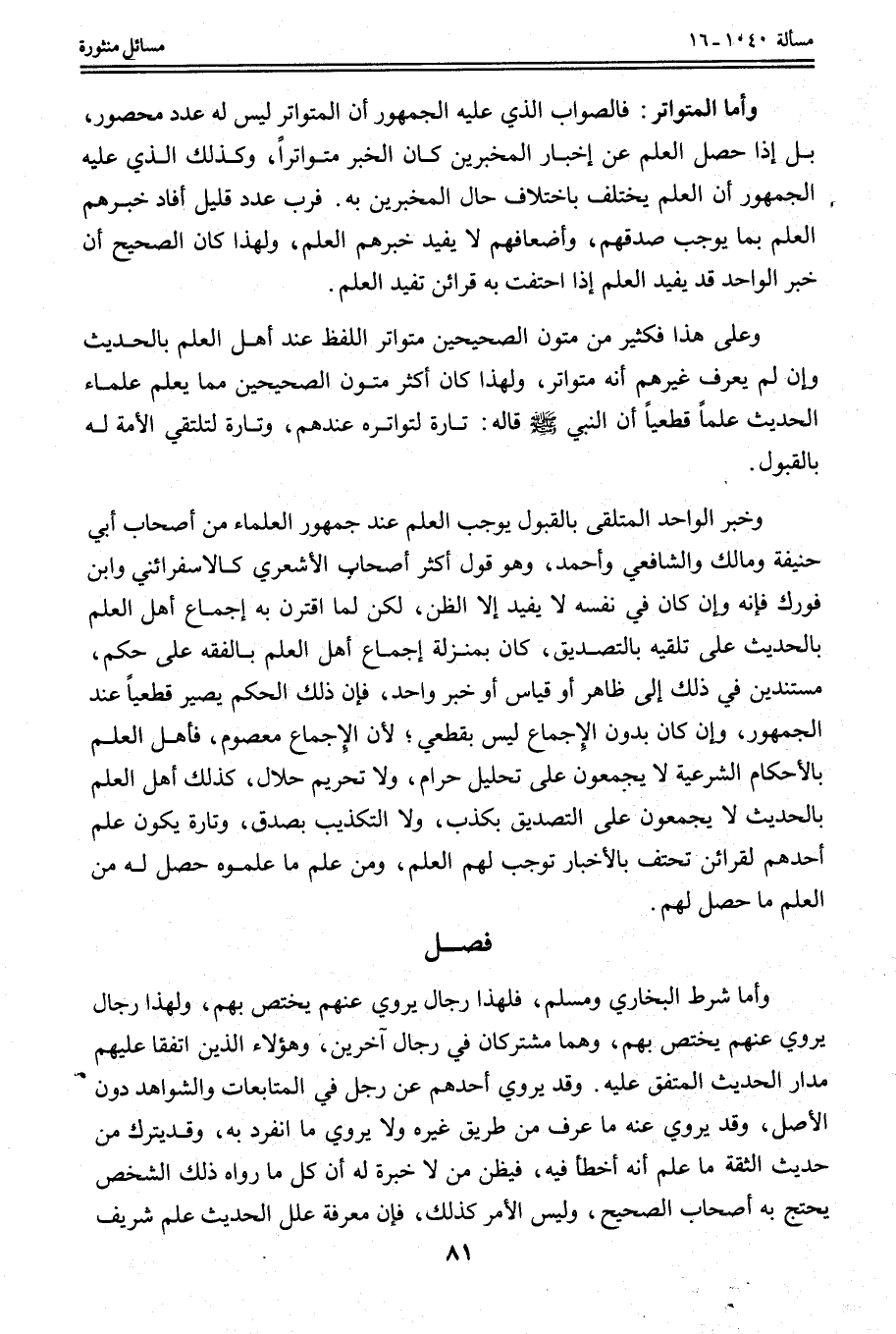 وَأَمَّا الْمُتَوَاتِرُ: فَالصَّوَابُ الَّذِي عَلَيْهِ الْجُمْهُورُ أَنَّ الْمُتَوَاتِرَ لَيْسَ لَهُ عَدَدٌ مَحْصُورٌ، بَلْ إذَا حَصَلَ الْعِلْمُ عَنْ إخْبَارِ الْمُخْبِرِينَ كَانَ الْخَبَرُ مُتَوَاتِرًا، وَكَذَلِكَ الَّذِي عَلَيْهِ الْجُمْهُورُ أَنَّ الْعِلْمَ يَخْتَلِفُ بِاخْتِلَافِ حَالِ الْمُخْبِرِينَ بِهِ.