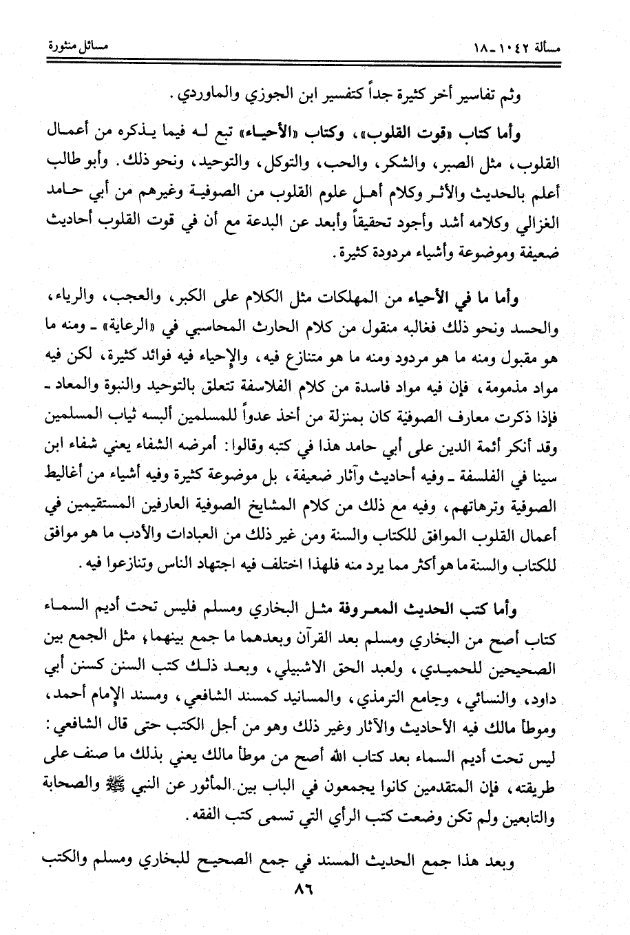وَأَمَّا مَا فِي الْإِحْيَاءِ مِنْ الْمُهْلِكَاتِ مِثْلِ الْكَلَامِ عَلَى الْكِبْرِ، وَالْعُجْبِ، وَالرِّيَاءِ، وَالْحَسَدِ وَنَحْوِ ذَلِكَ فَغَالِبُهُ مَنْقُولٌ مِنْ كَلَامِ الْحَارِثِ الْمُحَاسَبِيِّ فِي " الرِّعَايَةِ " - وَمِنْهُ مَا هُوَ مَقْبُولٌ وَمِنْهُ مَا هُوَ مَرْدُودٌ وَمِنْهُ مَا هُوَ مُتَنَازَعٌ فِيهِ، وَالْإِحْيَاءُ فِيهِ فَوَائِدُ كَثِيرَةٌ، لَكِنَّ فِيهِ مَوَادَّ مَذْمُومَةً، فَإِنَّ فِيهِ مَوَادَّ فَاسِدَةً مِنْ كَلَامِ الْفَلَاسِفَةِ تَتَعَلَّقُ بِالتَّوْحِيدِ وَالنُّبُوَّةِ وَالْمَعَادِ - فَإِذَا ذُكِرَتْ مَعَارِفُ الصُّوفِيَّةِ كَانَ بِمَنْزِلَةِ مَنْ أَخَذَ عَدُوًّا لِلْمُسْلِمِينَ أَلْبَسَهُ ثِيَابَ الْمُسْلِمِينَ وَقَدْ أَنْكَرَ أَئِمَّةُ الدِّينِ عَلَى أَبِي حَامِدٍ هَذَا فِي كُتُبِهِ وَقَالُوا: أَمْرَضَهُ الشِّفَاءُ يَعْنِي شِفَاءَ ابْنِ سِينَا فِي الْفَلْسَفَةِ - وَفِيهِ أَحَادِيثُ وَآثَارٌ ضَعِيفَةٌ، بَلْ مَوْضُوعَةٌ كَثِيرَةٌ وَفِيهِ أَشْيَاءُ مِنْ أَغَالِيطِ الصُّوفِيَّةِ وَتُرَّهَاتِهِمْ، وَفِيهِ مَعَ ذَلِكَ مِنْ كَلَامِ الْمَشَايِخِ الصُّوفِيَّةِ الْعَارِفِينَ الْمُسْتَقِيمِينَ فِي أَعْمَالِ الْقُلُوبِ الْمُوَافِقِ لِلْكِتَابِ وَالسُّنَّةِ وَمِنْ غَيْرِ ذَلِكَ مِنْ الْعِبَادَاتِ وَالْأَدَبِ مَا هُوَ مُوَافِقٌ لِلْكِتَابِ وَالسُّنَّةِ مَا هُوَ أَكْثَرُ مِمَّا يَرِدُ مِنْهُ فَلِهَذَا اخْتَلَفَ فِيهِ اجْتِهَادُ النَّاسِ وَتَنَازَعُوا فِيهِ.
