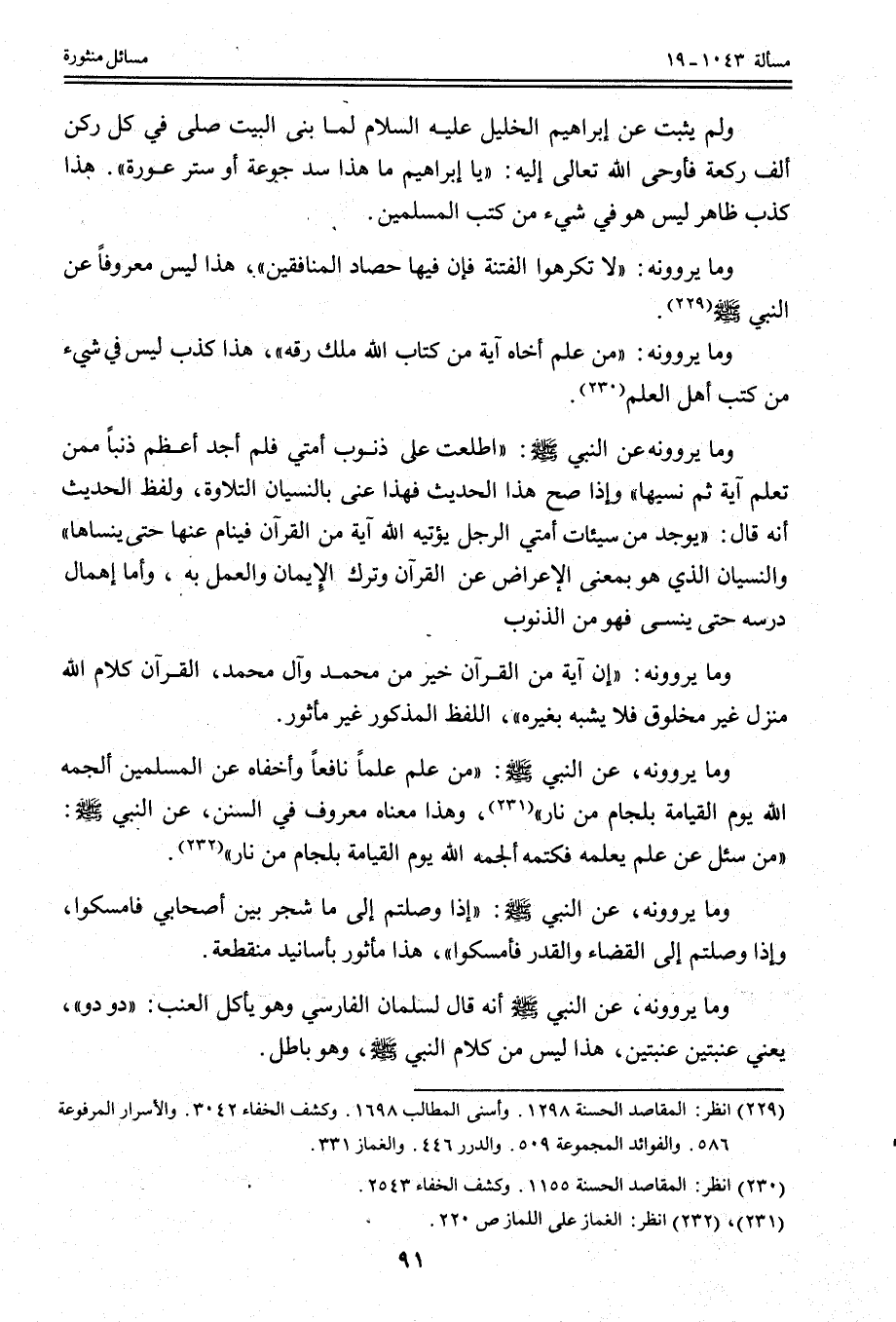 وَمَا يَرْوُونَهُ عَنْ النَّبِيِّ - صَلَّى اللَّهُ عَلَيْهِ وَسَلَّمَ -: «اطَّلَعَتْ عَلَى ذُنُوبِ أُمَّتِي فَلَمْ أَجِدْ أَعْظَمَ ذَنْبًا مِمَّنْ تَعَلَّمَ آيَةً ثُمَّ نَسِيَهَا» وَإِذَا صَحَّ هَذَا الْحَدِيثُ فَهَذَا عَنَى بِالنِّسْيَانِ التِّلَاوَةَ، وَلَفْظُ الْحَدِيثِ أَنَّهُ قَالَ: «يُوجَدُ مِنْ سَيِّئَاتِ أُمَّتِي الرَّجُلُ يُؤْتِيهِ اللَّهُ آيَةً مِنْ الْقُرْآنِ فَيَنَامُ عَنْهَا حَتَّى يَنْسَاهَا» وَالنِّسْيَانُ الَّذِي هُوَ بِمَعْنَى الْإِعْرَاضِ عَنْ الْقُرْآنِ وَتَرْكِ الْإِيمَانِ وَالْعَمَلِ بِهِ، وَأَمَّا إهْمَالُ دَرْسِهِ حَتَّى يُنْسَى فَهُوَ مِنْ الذُّنُوبِ وَمَا يَرْوُونَهُ: «إنَّ آيَةً مِنْ الْقُرْآنِ خَيْرٌ مِنْ مُحَمَّدٍ وَآلِ مُحَمَّدٍ، الْقُرْآنُ كَلَامُ اللَّهِ مُنَزَّلٌ غَيْرُ مَخْلُوقٍ فَلَا يُشَبَّهُ بِغَيْرِهِ» ، اللَّفْظُ الْمَذْكُورُ غَيْرُ مَأْثُورٍ.