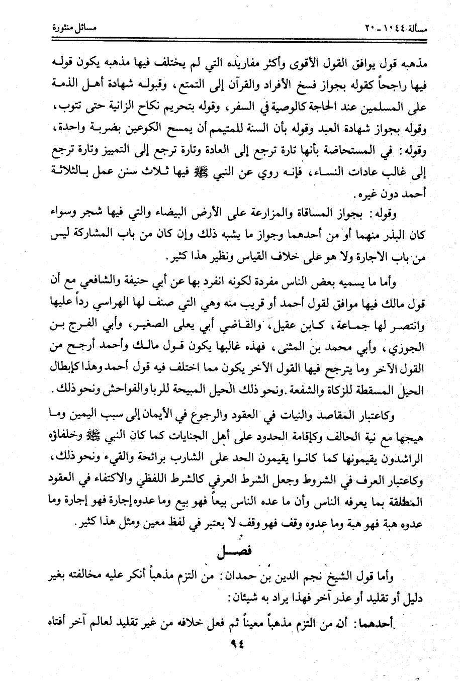 فَصْلٌ وَأَمَّا قَوْلُ الشَّيْخِ نَجْمِ الدِّينِ بْنِ حَمْدَانَ: مَنْ الْتَزَمَ مَذْهَبًا أُنْكِرَ عَلَيْهِ مُخَالَفَتُهُ بِغَيْرِ دَلِيلٍ أَوْ تَقْلِيدٍ أَوْ عُذْرٍ آخَرَ فَهَذَا يُرَادُ بِهِ شَيْئَانِ: أَحَدُهُمَا: أَنَّ مَنْ الْتَزَمَ مَذْهَبًا مُعَيَّنًا ثُمَّ فَعَلَ خِلَافَهُ مِنْ غَيْرِ تَقْلِيدٍ لِعَالِمٍ آخَرَ أَفْتَاهُ