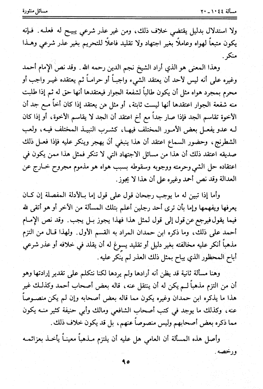 وَقَدْ نَصَّ الْإِمَامُ أَحْمَدُ وَغَيْرُهُ عَلَى أَنَّهُ لَيْسَ لِأَحَدِ أَنْ يَعْتَقِدَ الشَّيْءَ وَاجِبًا أَوْ حَرَامًا ثُمَّ يَعْتَقِدُهُ غَيْرَ وَاجِبٍ أَوْ مُحَرَّمٍ بِمُجَرَّدِ هَوَاهُ مِثْلُ أَنْ يَكُونَ طَالِبًا لِشُفْعَةِ الْجِوَارِ فَيَعْتَقِدُهَا أَنَّهَا حَقٌّ لَهُ ثُمَّ إذَا طُلِبَتْ مِنْهُ شُفْعَةُ الْجِوَارِ اعْتَقَدَهَا أَنَّهَا لَيْسَتْ ثَابِتَةً، أَوْ مِثْلُ مِنْ يَعْتَقِدَ إذَا كَانَ أَخًا مَعَ جَدٍّ أَنَّ الْإِخْوَةَ تُقَاسِمُ الْجَدَّ فَإِذَا صَارَ جَدًّا مَعَ أَخٍ اعْتَقَدَ أَنَّ الْجَدَّ لَا يُقَاسِمُ الْإِخْوَةَ، أَوْ إذَا كَانَ لَهُ عَدُوٌّ يَفْعَلُ بَعْضَ الْأُمُورِ الْمُخْتَلَفِ فِيهَا، كَشُرْبِ النَّبِيذِ الْمُخْتَلَفِ فِيهِ، وَلَعِبِ الشِّطْرَنْجِ، وَحُضُورِ السَّمَاعِ اعْتَقَدَ أَنَّ هَذَا يَنْبَغِي أَنْ يُهْجَرَ وَيُنْكَرَ عَلَيْهِ فَإِذَا فَعَلَ ذَلِكَ صَدِيقُهُ اعْتَقَدَ ذَلِكَ أَنْ هَذَا مِنْ مَسَائِلِ الِاجْتِهَادِ الَّتِي لَا تُنْكَرُ فَمِثْلُ هَذَا مِمَّنْ يَكُونُ فِي اعْتِقَادِهِ حِلُّ الشَّيْءِ وَحُرْمَتُهُ وَوُجُوبُهُ وَسُقُوطُهُ بِسَبَبِ هَوَاهُ هُوَ مَذْمُومٌ مَجْرُوحٌ خَارِجٌ عَنْ الْعَدَالَةِ وَقَدْ نَصَّ أَحْمَدُ وَغَيْرُهُ عَلَى أَنَّ هَذَا لَا يَجُوزُ.