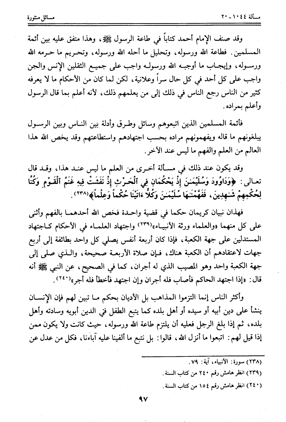 وَقَدْ صَنَّفَ الْإِمَامُ أَحْمَدُ كِتَابًا فِي طَاعَةِ الرَّسُولِ - صَلَّى اللَّهُ عَلَيْهِ وَسَلَّمَ - وَهَذَا مُتَّفَقٌ عَلَيْهِ بَيْنَ أَئِمَّةِ الْمُسْلِمِينَ.