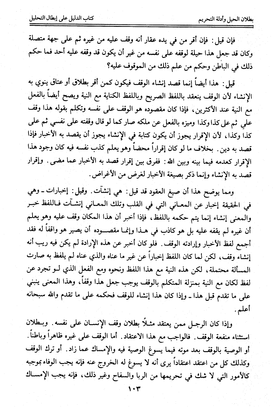 وَمِمَّا يُوَضِّحُ هَذَا أَنَّ صِيَغَ الْعُقُودِ قَدْ قِيلَ: هِيَ إنْشَاءَاتٌ. وَقِيلَ: إخْبَارَاتٌ - وَهِيَ فِي الْحَقِيقَةِ إخْبَارٌ عَنْ الْمَعَانِي الَّتِي فِي الْقَلْبِ وَتِلْكَ الْمَعَانِي أُنْشِئَتْ فَاللَّفْظُ خَبَرٌ وَالْمَعْنَى إنْشَاءٌ إنَّمَا يَتِمُّ حُكْمُهُ بِاللَّفْظِ، فَإِذَا أَخْبَرَ أَنَّ هَذَا الْمَكَانَ وَقْفٌ عَلَيْهِ وَهُوَ يَعْلَمُ أَنَّ غَيْرَهُ لَمْ يَقِفْهُ عَلَيْهِ بَلْ هُوَ كَاذِبٌ فِي هَذَا، وَإِنَّمَا مَقْصُودُهُ أَنْ يَصِيرَ هُوَ وَاقِفًا لَهُ فَقَدْ أَجْمَعَ لَفْظَ الْإِخْبَارِ، وَإِرَادَتَهُ الْوَقْفَ. فَلَوْ كَانَ أَخْبَرَ عَنْ هَذِهِ الْإِرَادَةِ لَمْ يَكُنْ فِيهِ رَيْبٌ أَنَّهُ إنْشَاءُ وَقْفٍ، لَكِنْ لَمَّا كَانَ اللَّفْظُ إخْبَارًا عَنْ غَيْرِ مَا عَنَاهُ وَاَلَّذِي عَنَاهُ لَمْ يَلْفِظْ بِهِ صَارَتْ الْمَسْأَلَةُ مُحْتَمَلَةً، لَكِنَّ هَذِهِ النِّيَّةَ مَعَ هَذَا اللَّفْظِ وَنَحْوِهِ وَمَعَ الْفِعْلِ الَّذِي لَوْ تَجَرَّدَ عَنْ لَفْظٍ لَكَانَ مَعَ النِّيَّةِ بِمَنْزِلَةِ الْمُتَكَلِّمِ بِالْوَقْفِ يُوجِبُ جَعْلَ هَذَا وَقْفًا، وَهَذَا الْمَعْنَى يَنْبَنِي عَلَى مَا تَقَدَّمَ قَبْلَ هَذَا -، وَإِذَا كَانَ هَذَا إنْشَاءٌ لِلْوَقْفِ فَحُكْمُهُ عَلَى مَا تَقَدَّمَ وَاَللَّهُ سُبْحَانَهُ أَعْلَمُ.