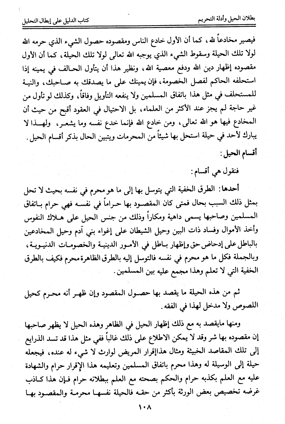 ِ فَنَقُولُ هِيَ أَقْسَامٌ: أَحَدُهَا: الطُّرُقُ الْخَفِيَّةُ الَّتِي يَتَوَسَّلُ بِهَا إلَى مَا هُوَ مُحَرَّمٌ فِي نَفْسِهِ بِحَيْثُ لَا تَحِلُّ بِمِثْلِ ذَلِكَ السَّبَبِ بِحَالٍ فَمَتَى كَانَ الْمَقْصُودُ بِهَا حَرَامًا فِي نَفْسِهِ فَهِيَ حَرَامٌ بِاتِّفَاقِ الْمُسْلِمِينَ وَصَاحِبُهَا يُسَمَّى دَاهِيَةً وَمَكَّارًا وَذَلِكَ مِنْ جِنْسِ الْحِيَلِ عَلَى هَلَاكِ النُّفُوسِ وَأَخْذِ الْأَمْوَالِ وَفَسَادِ ذَاتِ الْبَيْنِ وَحِيَلِ الشَّيْطَانِ عَلَى إغْوَاءِ بَنِي آدَمَ وَحِيَلِ الْمُخَادِعِينَ بِالْبَاطِلِ عَلَى إدْحَاضِ حَقٍّ، وَإِظْهَارِ بَاطِلٍ فِي الْأُمُورِ الدِّينِيَّةِ وَالْخُصُومَاتِ الدُّنْيَوِيَّةِ، وَبِالْجُمْلَةِ فَكُلُّ مَا هُوَ مُحَرَّمٌ فِي نَفْسِهِ فَالتَّوَسُّلُ إلَيْهِ بِالطُّرُقِ الظَّاهِرَةِ مُحَرَّمٌ فَكَيْفَ بِالطُّرُقِ الْخَفِيَّةِ الَّتِي لَا تُعْلَمُ وَهَذَا مُجْمَعٌ عَلَيْهِ بَيْنَ الْمُسْلِمِينَ.