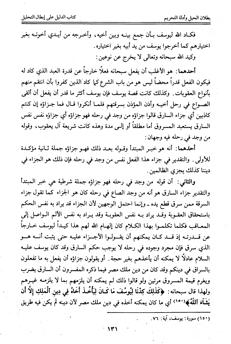 أَنَّ قَوْلَهُ {مَنْ وُجِدَ فِي رَحْلِهِ فَهُوَ جَزَاؤُهُ} [يوسف: 75] جُمْلَةٌ شَرْطِيَّةٌ هِيَ خَبَرُ الْمُبْتَدَإِ وَالتَّقْدِيرُ جَزَاءُ السَّارِقِ هُوَ أَنَّهُ مَنْ وُجِدَ الصَّاعُ فِي رَحْلِهِ كَانَ هُوَ الْجَزَاءَ كَمَا تَقُولُ جَزَاءُ السَّرِقَةِ مِمَّنْ سَرَقَ قَطْعُ يَدِهِ -، وَإِنَّمَا احْتَمَلَ الْوَجْهَيْنِ لِأَنَّ الْجَزَاءَ قَدْ يُرَادُ بِهِ نَفْسُ الْحُكْمِ بِاسْتِحْقَاقِ الْعُقُوبَةِ وَقَدْ يُرَادُ بِهِ نَفْسُ الْعُقُوبَةِ وَقَدْ يُرَادُ بِهِ نَفْسُ الْأَلَمِ الْوَاصِلِ إلَى الْمُعَاقَبِ فَكُلَّمَا تَكَلَّمُوا بِهَذَا الْكَلَامِ كَانَ إلْهَامُ اللَّهِ لَهُمْ هَذَا كَيْدًا لِيُوسُفَ خَارِجًا عَنْ قُدْرَتِهِ، إذْ قَدْ كَانَ يُمْكِنُهُمْ أَنْ يَقُولُوا الْإِجْزَاءُ عَلَيْهِ حَتَّى يَثْبُتَ أَنَّهُ هُوَ الَّذِي سَرَقَ فَإِنَّ مُجَرَّدَ وُجُودِهِ فِي رَحْلِهِ لَا يُوجِبُ حُكْمَ السَّارِقِ وَقَدْ كَانَ يُوسُفُ - عَلَيْهِ السَّلَامُ - عَادِلًا لَا يُمْكِنُهُ أَنْ يَأْخُذَهُمْ بِغَيْرِ حُجَّةٍ أَوْ يَقُولُونَ جَزَاؤُهُ أَنْ يُفْعَلَ بِهِ مَا تَفْعَلُونَ بِالسُّرَّاقِ فِي دِينِكُمْ وَقَدْ كَانَ مِنْ دِينِ مَلِكِ مِصْرَ فِيمَا ذَكَرَهُ الْمُفَسِّرُونَ أَنَّ السَّارِقَ يُضْرَبُ وَيَغْرَمُ قِيمَةَ الْمَسْرُوقِ مَرَّتَيْنِ وَلَوْ قَالُوا ذَلِكَ لَمْ يُمْكِنْهُ أَنْ يُلْزِمَهُمْ بِمَا لَا يُلْزِمُهُ غَيْرَهُمْ وَلِهَذَا قَالَ سُبْحَانَهُ: {كَذَلِكَ كِدْنَا لِيُوسُفَ مَا كَانَ لِيَأْخُذَ أَخَاهُ فِي دِينِ الْمَلِكِ إِلا أَنْ يَشَاءَ اللَّهُ} [يوسف: 76] أَيْ مَا كَانَ يُمْكِنُهُ أَخْذُهُ فِي دِينِ مَلِكِ مِصْرَ لِأَنَّ دِينَهُ لَمْ يَكُنْ فِيهِ طَرِيقٌ