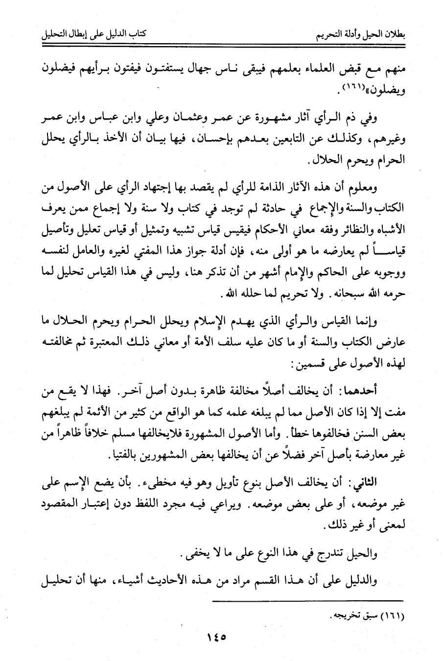 وَإِنَّمَا الْقِيَاسُ وَالرَّأْيُ الَّذِي يَهْدِمُ الْإِسْلَامَ وَيُحَلِّلُ الْحَرَامَ وَيُحَرِّمُ الْحَلَالَ مَا عَارَضَ الْكِتَابَ وَالسُّنَّةَ، أَوْ مَا كَانَ عَلَيْهِ سَلَفُ الْأُمَّةِ، أَوْ مَعَانِي ذَلِكَ الْمُعْتَبَرَةُ، ثُمَّ مُخَالَفَتُهُ لِهَذِهِ الْأُصُولِ عَلَى قِسْمَيْنِ: أَحَدُهُمَا: أَنْ يُخَالِفَ أَصْلًا مُخَالَفَةً ظَاهِرَةً بِدُونِ أَصْلٍ آخَرَ. فَهَذَا لَا يَقَعُ مِنْ مُفْتٍ إلَّا إذَا كَانَ الْأَصْلُ مِمَّا لَمْ يَبْلُغْهُ عِلْمُهُ كَمَا هُوَ الْوَاقِعُ مِنْ كَثِيرٍ مِنْ الْأَئِمَّةِ لَمْ يَبْلُغْهُمْ بَعْضُ السُّنَنِ فَخَالَفُوهَا خَطَأً.