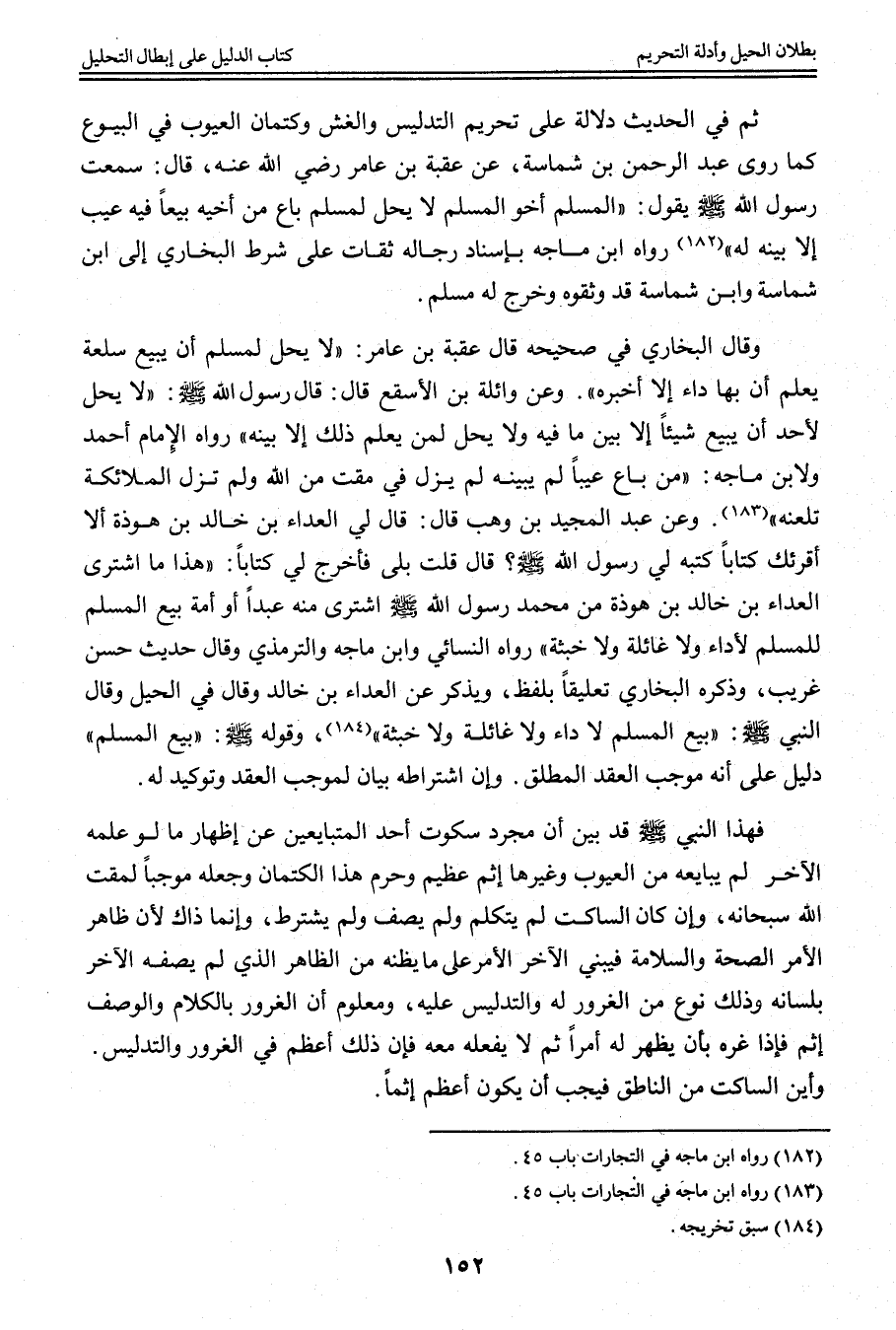 وَعَنْ وَاثِلَةَ بْنِ الْأَسْقَعِ قَالَ: قَالَ رَسُولُ اللَّهِ - صَلَّى اللَّهُ عَلَيْهِ وَسَلَّمَ -: «لَا يَحِلُّ لِأَحَدٍ أَنْ يَبِيعَ شَيْئًا إلَّا بَيَّنَ مَا فِيهِ وَلَا يَحِلُّ لِمَنْ يَعْلَمُ ذَلِكَ إلَّا بَيَّنَهُ» رَوَاهُ الْإِمَامُ أَحْمَدُ وَلِابْنِ مَاجَهْ: «مَنْ بَاعَ عَيْبًا لَمْ يُبَيِّنْهُ لَمْ يَزَلْ فِي مَقْتٍ مِنْ اللَّهِ وَلَمْ تَزَلْ الْمَلَائِكَةُ تَلْعَنُهُ» . وَعَنْ عَبْدِ الْمَجِيدِ بْنِ وَهْبٍ قَالَ: قَالَ لِي الْعَدَّاءُ بْنُ خَالِدِ بْنِ هَوْذَةَ أَلَا أُقْرِئُكَ كِتَابًا كَتَبَهُ لِي رَسُولُ اللَّهِ - صَلَّى اللَّهُ عَلَيْهِ وَسَلَّمَ -؟ قَالَ قُلْتُ: بَلَى فَأَخْرَجَ لِي كِتَابًا: «هَذَا مَا اشْتَرَى الْعَدَّاءُ بْنُ خَالِدِ بْنِ هَوْذَةَ مِنْ مُحَمَّدٍ رَسُولِ اللَّهِ - صَلَّى اللَّهُ عَلَيْهِ وَسَلَّمَ - اشْتَرَى مِنْهُ عَبْدًا، أَوْ أَمَةً بَيْعَ الْمُسْلِمِ لِلْمُسْلِمِ لَا دَاءَ وَلَا غَائِلَةَ وَلَا خِبْثَةَ» رَوَاهُ النَّسَائِيّ وَابْنُ مَاجَهْ وَالتِّرْمِذِيُّ وَقَالَ حَدِيثٌ حَسَنٌ غَرِيبٌ، وَذَكَرَهُ الْبُخَارِيُّ تَعْلِيقًا بِلَفْظِ:، وَيُذْكَرُ عَنْ الْعَدَّاءِ بْنِ خَالِدٍ وَقَالَ فِي الْحِيَلِ «وَقَالَ النَّبِيُّ - صَلَّى اللَّهُ عَلَيْهِ وَسَلَّمَ -: بَيْعُ الْمُسْلِمِ لَا دَاءَ وَلَا غَائِلَةَ وَلَا خِبْثَةَ» ، وَقَوْلُهُ - صَلَّى اللَّهُ عَلَيْهِ وَسَلَّمَ -: " بَيْعُ الْمُسْلِمِ " دَلِيلٌ عَلَى أَنَّهُ مُوجَبُ الْعَقْدِ الْمُطْلَقِ. وَأَنَّ اشْتِرَاطَهُ بَيَانٌ لِمُوجَبِ الْعَقْدِ وَتَوْكِيدٌ لَهُ.