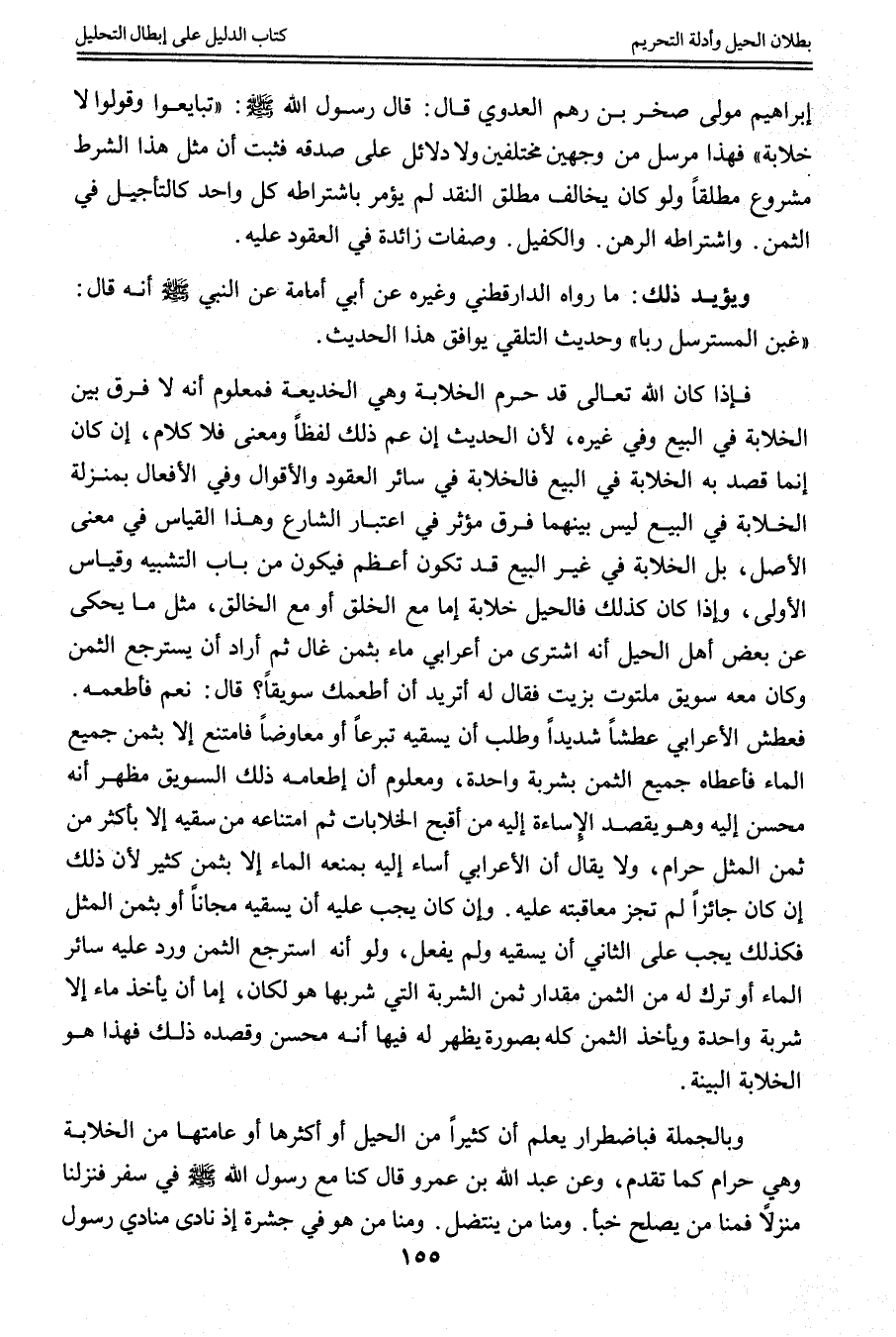 إبْرَاهِيمَ مَوْلَى صَخْرِ بْنِ رُهْمٍ الْعَدَوِيُّ قَالَ: قَالَ رَسُولُ اللَّهِ - صَلَّى اللَّهُ عَلَيْهِ وَسَلَّمَ -: «تَبَايَعُوا وَقُولُوا لَا خِلَابَةَ» فَهَذَا مُرْسَلٌ مِنْ وَجْهَيْنِ مُخْتَلِفَيْنِ وَلَا دَلَائِلَ عَلَى صِدْقِهِ فَثَبَتَ أَنَّ مِثْلَ هَذَا الشَّرْطِ مَشْرُوعٌ مُطْلَقًا وَلَوْ كَانَ يُخَالِفُ مُطْلَقَ النَّقْدِ لَمْ يُؤْمَرْ بِاشْتِرَاطِهِ كُلُّ وَاحِدٍ كَالتَّأْجِيلِ فِي الثَّمَنِ وَاشْتِرَاطِهِ الرَّهْنَ، وَالْكَفِيلَ، وَصِفَاتٍ زَائِدَةٍ فِي الْعُقُودِ عَلَيْهِ.