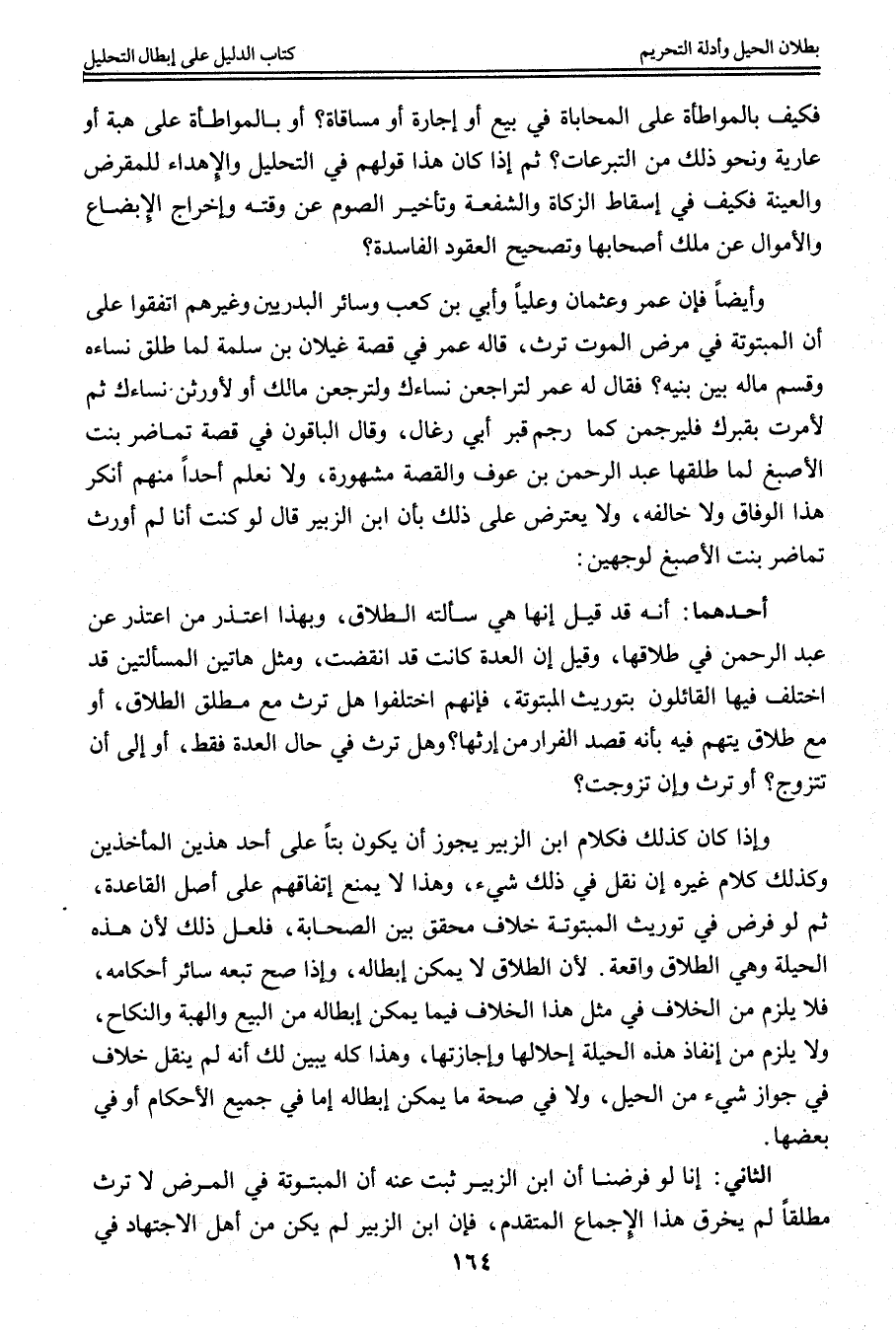 ثُمَّ لَوْ فُرِضَ فِي تَوْرِيثِ الْمَبْتُوتَةِ خِلَافٌ مُحَقَّقٌ بَيْنَ الصَّحَابَةِ، فَلَعَلَّ ذَلِكَ؛ لِأَنَّ هَذِهِ الْحِيلَةَ وَهِيَ الطَّلَاقُ وَاقِعَةٌ؛ لِأَنَّ الطَّلَاقَ لَا يُمْكِنُ إبْطَالُهُ، وَإِذَا صَحَّ تَبِعَهُ سَائِرُ أَحْكَامِهِ، فَلَا يَلْزَمُ مِنْ الْخِلَافِ فِي مِثْلِ هَذَا الْخِلَافُ فِيمَا يُمْكِنُ إبْطَالُهُ مِنْ الْبَيْعِ وَالْهِبَةِ وَالنِّكَاحِ، وَلَا يَلْزَمُ مِنْ إنْفَاذِ هَذِهِ الْحِيلَةِ إحْلَالُهَا وَإِجَازَتُهَا، وَهَذَا كُلُّهُ يُبَيِّنُ لَك أَنَّهُ لَمْ يُنْقَلْ خِلَافٌ فِي جَوَازِ شَيْءٍ مِنْ الْحِيَلِ، وَلَا فِي صِحَّةِ مَا يُمْكِنُ إبْطَالُهُ إمَّا فِي جَمِيعِ الْأَحْكَامِ أَوْ فِي بَعْضِهَا. الثَّانِي: أَنَّا لَوْ فَرَضْنَا أَنَّ ابْنَ الزُّبَيْرِ ثَبَتَ عَنْهُ أَنَّ الْمَبْتُوتَةَ فِي الْمَرَضِ لَا تَرِثُ مُطْلَقًا لَمْ يَخْرِقْ هَذَا الْإِجْمَاعَ الْمُتَقَدِّمَ، فَإِنَّ ابْنَ الزُّبَيْرِ لَمْ يَكُنْ مِنْ أَهْلِ الِاجْتِهَادِ فِي