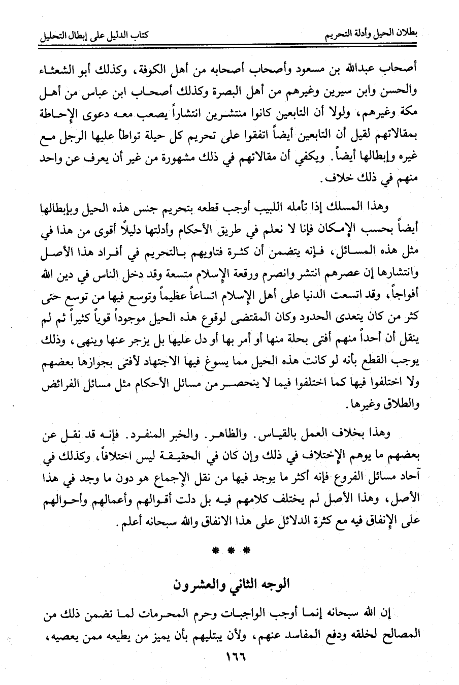 وَيَكْفِي أَنَّ مَقَالَاتِهِمْ فِي ذَلِكَ مَشْهُورَةٌ مِنْ غَيْرِ أَنْ يُعْرَفَ عَنْ وَاحِدٍ مِنْهُمْ فِي ذَلِكَ خِلَافٌ. وَهَذَا الْمَسْلَكُ إذَا تَأَمَّلَهُ اللَّبِيبُ أَوْجَبَ قَطْعَهُ بِتَحْرِيمِ جِنْسِ هَذِهِ الْحِيَلِ وَبِإِبْطَالِهَا أَيْضًا بِحَسَبِ الْإِمْكَانِ فَإِنَّا لَا نَعْلَمُ فِي طَرِيقِ الْأَحْكَامِ وَأَدِلَّتِهَا دَلِيلًا أَقْوَى مِنْ هَذَا فِي مِثْلِ هَذِهِ الْمَسَائِلِ، فَإِنَّهُ يَتَضَمَّنُ أَنَّ كَثْرَةَ فَتَاوِيهِمْ بِالتَّحْرِيمِ فِي أَفْرَادِ هَذَا الْأَصْلِ وَانْتِشَارِهَا أَنَّ عَصْرَهُمْ انْتَشَرَ وَانْصَرَمَ وَرُقْعَةُ الْإِسْلَامِ مُتَّسِعَةٌ وَقَدْ دَخَلَ النَّاسُ فِي دِينِ اللَّهِ أَفْوَاجًا، وَقَدْ اتَّسَعَتْ الدُّنْيَا عَلَى أَهْلِ الْإِسْلَامِ اتِّسَاعًا عَظِيمًا وَتَوَسَّعَ فِيهَا مَنْ تَوَسَّعَ حَتَّى كَثُرَ مَنْ كَانَ يَتَعَدَّى الْحُدُودَ وَكَانَ الْمُقْتَضِي لِوُقُوعِ هَذِهِ الْحِيَلِ مَوْجُودًا قَوِيًّا كَثِيرًا ثُمَّ لَمْ يُنْقَلْ أَنَّ أَحَدًا مِنْهُمْ أَفْتَى بِحِلِّهِ مِنْهَا أَوْ أَمَرَ بِهَا أَوْ دَلَّ عَلَيْهَا بَلْ يَزْجَرُ عَنْهَا وَيَنْهَى، وَذَلِكَ يُوجِبُ الْقَطْعَ بِأَنَّهُ لَوْ كَانَتْ هَذِهِ الْحِيَلُ مِمَّا يَسُوغُ فِيهَا الِاجْتِهَادُ لَأَفْتَى بِجَوَازِهَا بَعْضُهُمْ وَلَاخْتَلَفُوا فِيهَا كَمَا اخْتَلَفُوا فِيمَا لَا يَنْحَصِرُ مِنْ مَسَائِلِ الْأَحْكَامِ مِثْلُ مَسَائِلِ الْفَرَائِضِ وَالطَّلَاقِ وَغَيْرِهَا.