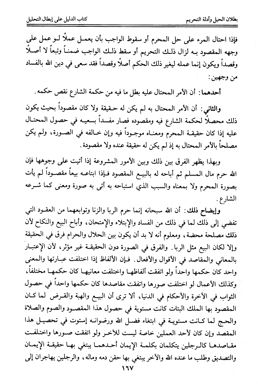 فَإِذَا احْتَالَ الْمَرْءُ عَلَى حِلِّ الْمُحَرَّمِ أَوْ سُقُوطِ الْوَاجِبِ بِأَنْ يَعْمَلَ عَمَلًا لَوْ عُمِلَ عَلَى وَجْهِهِ الْمَقْصُودِ بِهِ لَزَالَ ذَلِكَ التَّحْرِيمُ أَوْ سَقَطَ ذَلِكَ الْوَاجِبُ ضِمْنًا وَتَبَعًا لَا أَصْلًا وَقَصْدًا وَيَكُونُ إنَّمَا عَمِلَهُ لِيُغَيِّرَ ذَلِكَ الْحُكْمَ أَصْلًا وَقَصْدًا فَقَدْ سَعَى فِي دِينِ اللَّهِ بِالْفَسَادِ مِنْ وَجْهَيْنِ. أَحَدُهُمَا: أَنَّ الْأَمْرَ الْمُحْتَالَ عَلَيْهِ بَطَلَ مَا فِيهِ مِنْ حِكْمَةِ الشَّارِعِ نَقَصَ حُكْمُهُ. وَالثَّانِي: أَنَّ الْأَمْرَ الْمُحْتَالَ بِهِ لَمْ يَكُنْ لَهُ حَقِيقَةً وَلَا كَانَ مَقْصُودًا بِحَيْثُ يَكُونُ ذَلِكَ مُحَصِّلًا لِحِكْمَةِ الشَّارِعِ فِيهِ وَمَقْصُودِهِ فَصَارَ مُفْسِدًا بِسَعْيِهِ فِي حُصُولِ الْمُحْتَالِ عَلَيْهِ إذَا كَانَ حَقِيقَةُ الْمُحَرَّمِ وَمَعْنَاهُ مَوْجُودًا فِيهِ وَإِنْ خَالَفَهُ فِي الصُّورَةِ، وَلَمْ يَكُنْ مُصْلِحًا بِالْأَمْرِ الْمُحْتَالِ بِهِ إذْ لَمْ يَكُنْ لَهُ حَقِيقَةٌ عِنْدَهُ وَلَا مَقْصُودَةٌ.