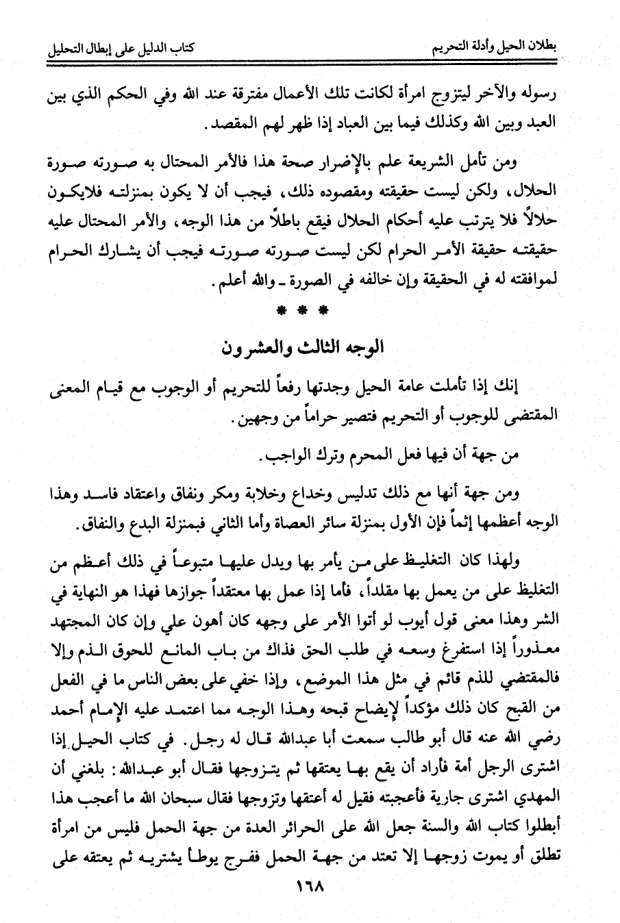 الْوَجْهُ الثَّالِثُ وَالْعِشْرُونَ: إنَّك إذَا تَأَمَّلْت عَامَّةَ الْحِيَلِ وَجَدْتهَا رَفْعًا لِلتَّحْرِيمِ أَوْ الْوُجُوبِ مَعَ قِيَامِ الْمَعْنَى الْمُقْتَضِي لِلْوُجُوبِ أَوْ التَّحْرِيمِ فَتَصِيرُ حَرَامًا مِنْ وَجْهَيْنِ. مِنْ جِهَةِ أَنَّ فِيهَا فِعْلَ الْمُحَرَّمِ وَتَرْكَ الْوَاجِبِ.