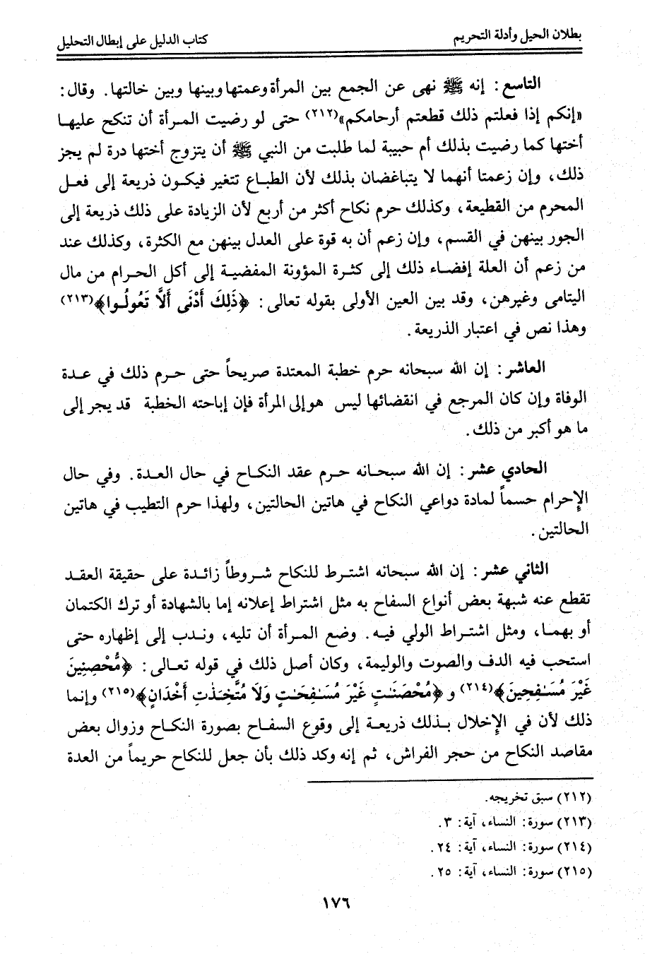 الْعَاشِرُ: أَنَّ اللَّهَ سُبْحَانَهُ حَرَّمَ خِطْبَةَ الْمُعْتَدَّةِ صَرِيحًا حَتَّى حَرَّمَ ذَلِكَ فِي عِدَّةِ الْوَفَاةِ، وَإِنْ كَانَ الْمَرْجِعُ فِي انْقِضَائِهَا لَيْسَ هُوَ إلَى الْمَرْأَةِ فَإِنَّ إبَاحَتَهُ الْخِطْبَةَ قَدْ يَجُرُّ إلَى مَا هُوَ أَكْبَرُ مِنْ ذَلِكَ. الْحَادِيَ عَشَرَ: أَنَّ اللَّهَ سُبْحَانَهُ حَرَّمَ عَقْدَ النِّكَاحِ فِي حَالِ الْعِدَّةِ.
