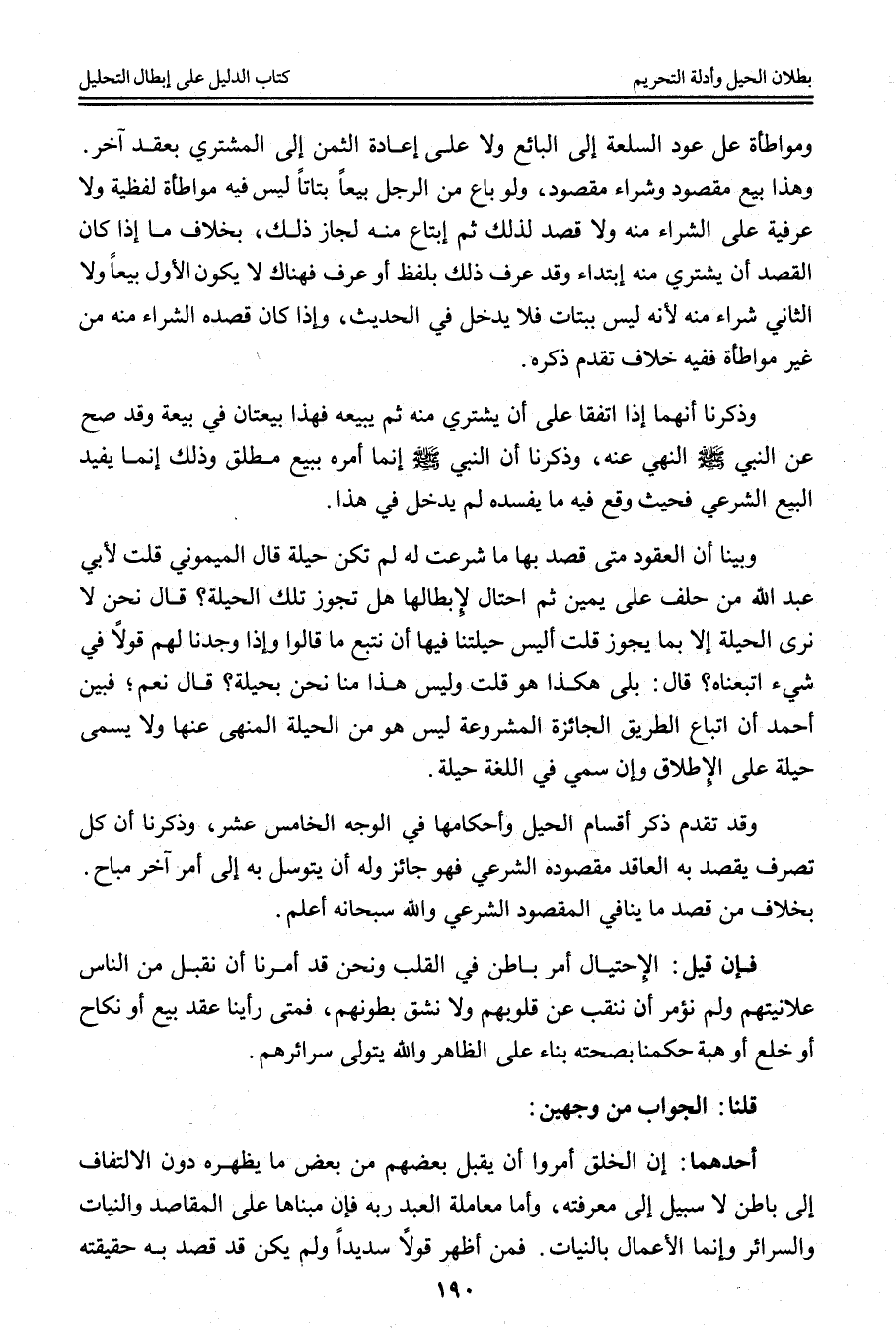 وَقَدْ تَقَدَّمَ ذِكْرُ أَقْسَامِ الْحِيَلِ وَأَحْكَامِهَا فِي الْوَجْهِ الْخَامِسَ عَشَرَ، وَذَكَرْنَا أَنَّ كُلَّ تَصَرُّفٍ يَقْصِدُ بِهِ الْعَاقِدُ مَقْصُودَهُ الشَّرْعِيَّ فَهُوَ جَائِزٌ وَلَهُ أَنْ يَتَوَسَّلَ بِهِ إلَى أَمْرٍ آخَرَ مُبَاحٍ. بِخِلَافِ مَنْ قَصَدَ مَا يُنَافِي الْمَقْصُودَ الشَّرْعِيَّ، وَاَللَّهُ سُبْحَانَهُ أَعْلَمُ. فَإِنْ قِيلَ: الِاحْتِيَالُ أَمْرٌ بَاطِنٌ فِي الْقَلْبِ وَنَحْنُ قَدْ أُمِرْنَا أَنْ نَقْبَلَ مِنْ النَّاسِ عَلَانِيَتَهُمْ وَلَمْ نُؤْمَرْ أَنْ نُنَقِّبَ عَنْ قُلُوبِهِمْ وَلَا نَشُقَّ بُطُونَهُمْ، فَمَتَى رَأَيْنَا عَقْدَ بَيْعٍ أَوْ نِكَاحٍ أَوْ خُلْعٍ أَوْ هِبَةٍ حَكَمْنَا بِصِحَّتِهِ بِنَاءً عَلَى الظَّاهِرِ وَاَللَّهُ يَتَوَلَّى سَرَائِرَهُمْ. قُلْنَا: الْجَوَابُ مِنْ وَجْهَيْنِ. أَحَدُهُمَا: أَنَّ الْخَلْقَ أُمِرُوا أَنْ يَقْبَلَ بَعْضُهُمْ مِنْ بَعْضٍ مَا يُظْهِرُهُ دُونَ الِالْتِفَافِ إلَى بَاطِنٍ لَا سَبِيلَ إلَى مَعْرِفَتِهِ، وَأَمَّا مُعَامَلَةُ الْعَبْدِ رَبَّهُ فَإِنَّ مَبْنَاهَا عَلَى الْمَقَاصِدِ وَالنِّيَّاتِ وَالسَّرَائِرِ وَإِنَّمَا الْأَعْمَالُ بِالنِّيَّاتِ. فَمَنْ أَظْهَرَ قَوْلًا سَدِيدًا وَلَمْ يَكُنْ قَدْ قَصَدَ بِهِ حَقِيقَتَهُ