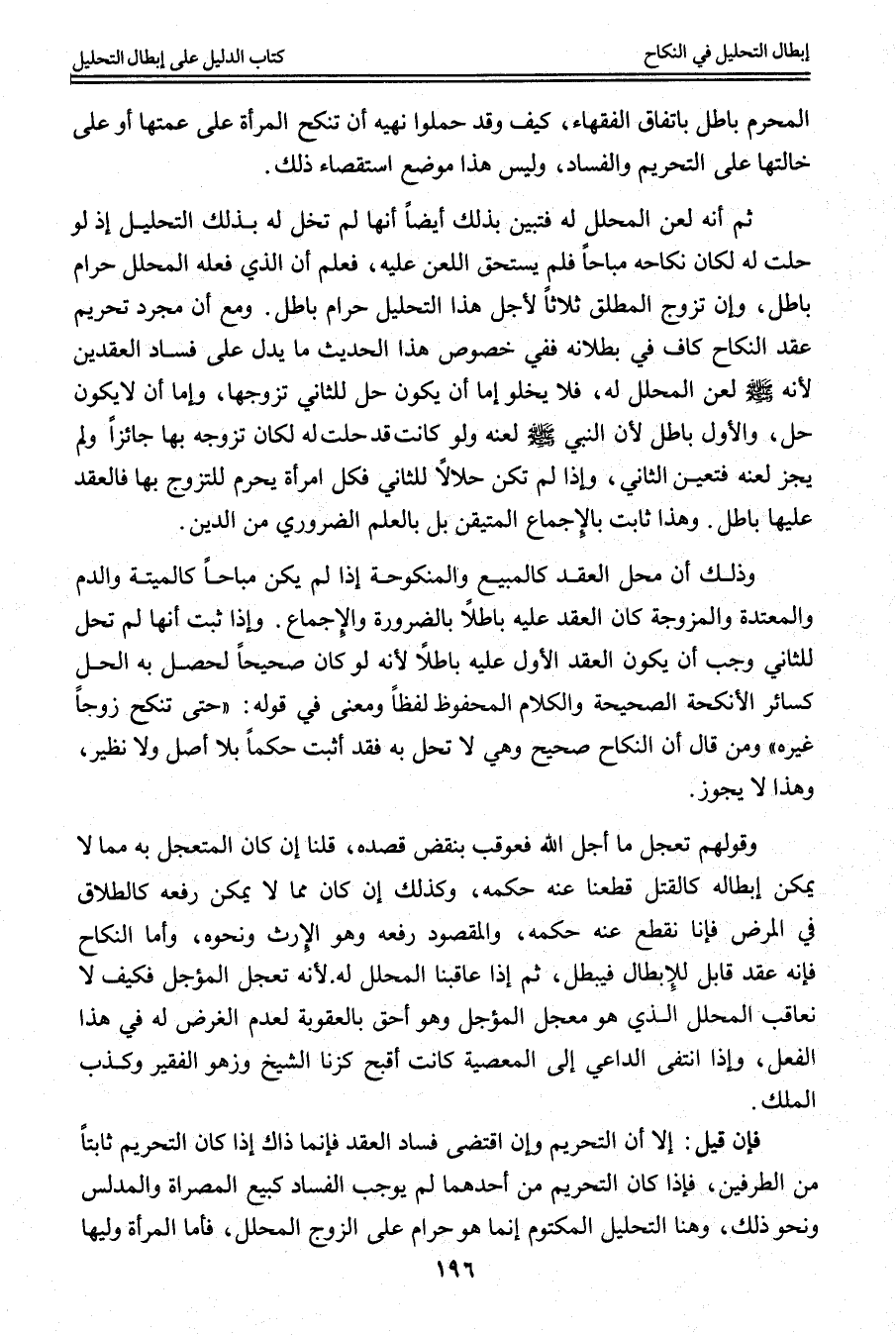 ثُمَّ إنَّهُ لَعَنَ الْمُحَلَّلَ لَهُ فَتَبَيَّنَ بِذَلِكَ أَيْضًا أَنَّهَا لَمْ تَحِلَّ لَهُ بِذَلِكَ التَّحْلِيلِ إذْ لَوْ حَلَّتْ لَهُ لَكَانَ نِكَاحُهُ مُبَاحًا فَلَمْ يَسْتَحِقَّ اللَّعْنَ عَلَيْهِ، فَعُلِمَ أَنَّ الَّذِي فَعَلَهُ الْمُحَلِّلُ حَرَامٌ بَاطِلٌ، وَأَنَّ تَزَوُّجَ الْمُطَلِّقِ ثَلَاثًا لِأَجْلِ هَذَا التَّحْلِيلِ حَرَامٌ بَاطِلٌ. وَمَعَ أَنَّ مُجَرَّدَ تَحْرِيمِ عَقْدِ النِّكَاحِ كَافٍ فِي بُطْلَانِهِ فَفِي خُصُوصِ هَذَا الْحَدِيثِ مَا يَدُلُّ عَلَى فَسَادِ الْعَقْدَيْنِ لِأَنَّهُ - صَلَّى اللَّهُ عَلَيْهِ وَسَلَّمَ - لَعَنَ الْمُحَلَّلَ لَهُ، فَلَا يَخْلُو إمَّا أَنْ يَكُونَ حَلَّ لِلثَّانِي تَزَوُّجُهَا، وَإِمَّا أَنْ لَا يَكُونَ حَلَّ، وَالْأَوَّلُ بَاطِلٌ؛ لِأَنَّ النَّبِيَّ - صَلَّى اللَّهُ عَلَيْهِ وَسَلَّمَ - لَعَنَهُ وَلَوْ كَانَتْ قَدْ حَلَّتْ لَهُ لَكَانَ تَزَوُّجُهُ بِهَا جَائِزًا وَلَمْ يَجُزْ لَعْنُهُ فَتَعَيَّنَ الثَّانِي، وَإِذَا لَمْ تَكُنْ حَلَالًا لِلثَّانِي فَكُلُّ امْرَأَةٍ يَحْرُمُ التَّزَوُّجُ بِهَا فَالْعَقْدُ عَلَيْهَا بَاطِلٌ. وَهَذَا ثَابِتٌ بِالْإِجْمَاعِ الْمُتَيَقَّنِ بَلْ بِالْعِلْمِ الضَّرُورِيِّ مِنْ الدِّينِ.