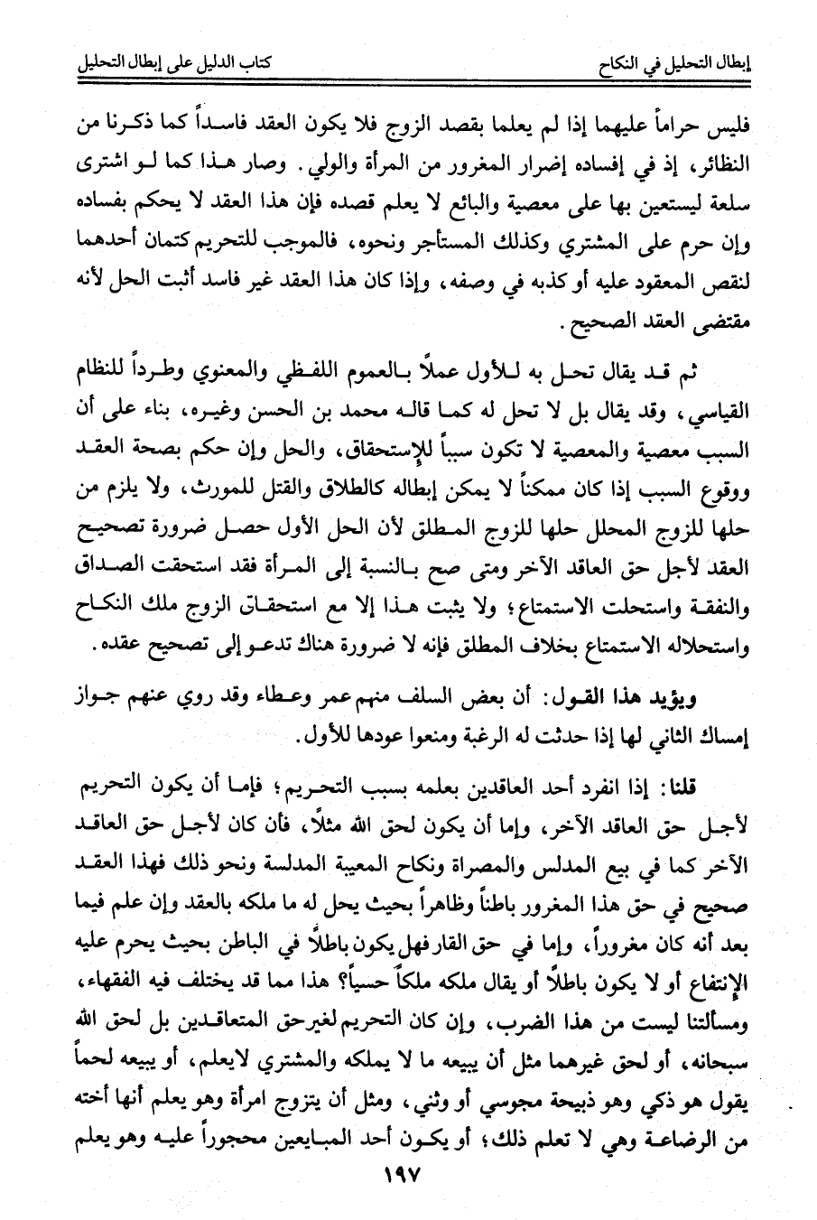 وَيُؤَيِّدُ هَذَا الْقَوْلَ: أَنَّ بَعْضَ السَّلَفِ مِنْهُمْ عُمَرُ وَعَطَاءٌ وَقَدْ رُوِيَ عَنْهُمْ جَوَازُ إمْسَاكِ الثَّانِي لَهَا إذَا حَدَثَتْ لَهُ الرَّغْبَةُ وَمَنَعُوا عَوْدَهَا لِلْأَوَّلِ. قُلْنَا: إذَا انْفَرَدَ أَحَدُ الْعَاقِدَيْنِ بِعِلْمِهِ بِسَبَبِ التَّحْرِيمِ؛ فَإِمَّا أَنْ يَكُونَ التَّحْرِيمُ لِأَجْلِ حَقِّ الْعَاقِدِ الْآخَرِ، وَإِمَّا أَنْ يَكُونَ لِحَقِّ اللَّهِ مَثَلًا، فَإِنْ كَانَ لِأَجْلِ حَقِّ الْعَاقِدِ الْآخَرِ كَمَا فِي بَيْعِ الْمُدَلِّسِ وَالْمُصَرَّاةِ وَنِكَاحِ الْمَعِيبَةِ الْمُدَلِّسَةِ وَنَحْوِ ذَلِكَ فَهَذَا الْعَقْدُ صَحِيحٌ فِي حَقِّ هَذَا الْمَغْرُورِ بَاطِنًا وَظَاهِرًا بِحَيْثُ يَحِلُّ لَهُ مَا مَلَكَهُ بِالْعَقْدِ وَإِنْ عَلِمَ فِيمَا بَعْدَ أَنَّهُ كَانَ مَغْرُورًا، وَإِمَّا فِي حَقِّ الْقَارِّ فَهَلْ يَكُونُ بَاطِلًا فِي الْبَاطِنِ بِحَيْثُ يَحْرُمُ عَلَيْهِ الِانْتِفَاعُ أَوْ لَا يَكُونُ بَاطِلًا أَوْ يُقَالُ مَلَكَهُ مِلْكًا حِسِّيًّا؟ هَذَا مِمَّا قَدْ يَخْتَلِفُ فِيهِ الْفُقَهَاءُ، وَمَسْأَلَتُنَا لَيْسَتْ مِنْ هَذَا الضَّرْبِ، وَإِنْ كَانَ التَّحْرِيمُ لِغَيْرِ حَقِّ الْمُتَعَاقِدَيْنِ بَلْ لِحَقِّ اللَّهِ سُبْحَانَهُ، أَوْ لِحَقِّ غَيْرِهِمَا مِثْلَ أَنْ يَبِيعَهُ مَا لَا يَمْلِكُهُ وَالْمُشْتَرِي لَا يَعْلَمُ، أَوْ يَبِيعَهُ لَحْمًا يَقُولُ هُوَ ذَكِيٌّ وَهُوَ ذَبِيحَةُ مَجُوسِيٍّ أَوْ وَثَنِيٍّ، وَمِثْلَ أَنْ يَتَزَوَّجَ امْرَأَةً وَهُوَ يَعْلَمُ أَنَّهَا أُخْتُهُ مِنْ الرَّضَاعَةِ وَهِيَ لَا تَعْلَمُ ذَلِكَ؛ أَوْ يَكُونُ أَحَدُ الْمُبَايِعَيْنِ مَحْجُورًا عَلَيْهِ وَهُوَ يَعْلَمُ
