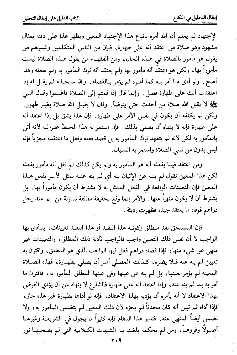 الِاجْتِهَادِ لَمْ يَعْلَمْ أَنَّ اللَّهَ أَمَرَهُ بِاتِّبَاعِ هَذَا الِاجْتِهَادِ الْمُعَيَّنِ وَيَظْهَرُ هَذَا عَلَى دِقَّتِهِ بِمِثَالٍ مَشْهُودٍ وَهُوَ صَلَاةُ مَنْ اعْتَقَدَ أَنَّهُ عَلَى طَهَارَةٍ، فَإِنَّ مِنْ النَّاسِ الْمُتَكَلِّمِينَ وَغَيْرِهِمْ مَنْ يَقُولُ هُوَ مَأْمُورٌ بِالصَّلَاةِ فِي هَذِهِ الْحَالِ، وَمِنْ الْفُقَهَاءِ مَنْ يَقُولُ هَذِهِ الصَّلَاةُ لَيْسَتْ مَأْمُورًا بِهَا، وَلَكِنْ هُوَ اعْتَقَدَ أَنَّهُ مَأْمُورٌ بِهَا وَلَمْ يَعْتَقِدْ أَنَّهُ تَرَكَ الْمَأْمُورَ بِهِ وَلَمْ يَفْعَلْهُ وَهَذَا أَصَحُّ.