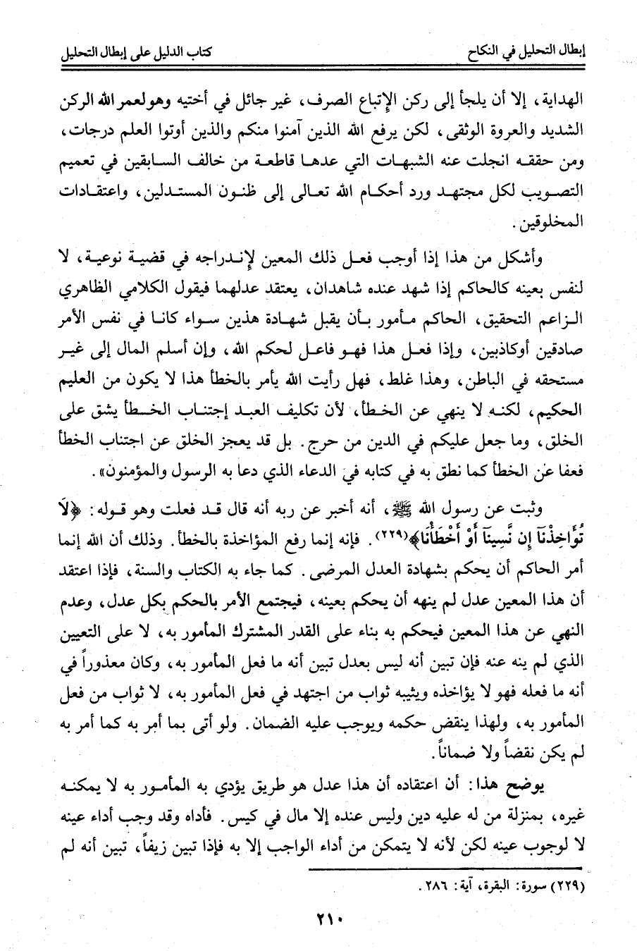 وَأَشْكَلَ مِنْ هَذَا إذَا أَوْجَبَ فِعْلَ ذَلِكَ الْمُعَيَّنِ لِانْدِرَاجِهِ فِي قَضِيَّةٍ نَوْعِيَّةٍ، لَا لِنَفْسٍ بِعَيْنِهِ كَالْحَاكِمِ إذَا شَهِدَ عِنْدَهُ شَاهِدَانِ، يَعْتَقِدُ عَدْلَهُمَا فَيَقُولُ الْكَلَامِيُّ الظَّاهِرِيُّ الزَّاعِمُ التَّحْقِيقَ، الْحَاكِمُ مَأْمُورٌ بِأَنْ يَقْبَلَ شَهَادَةَ هَذَيْنِ سَوَاءٌ كَانَا فِي نَفْسِ الْأَمْرِ صَادِقَيْنِ أَوْ كَاذِبَيْنِ، وَإِذَا فَعَلَ هَذَا فَهُوَ فَاعِلٌ لِحُكْمِ اللَّهِ، وَإِنْ أَسْلَمَ الْمَالَ إلَى غَيْرِ مُسْتَحِقِّهِ فِي الْبَاطِنِ، وَهَذَا غَلَطٌ، فَهَلْ رَأَيْتَ اللَّهَ يَأْمُرُ بِالْخَطَإِ هَذَا لَا يَكُونُ مِنْ الْعَلِيمِ الْحَكِيمِ، لَكِنَّهُ لَا يَنْهَى عَنْ الْخَطَإِ؛ لِأَنَّ تَكْلِيفَ الْعَبْدِ اجْتِنَابَ الْخَطَإِ يَشُقُّ عَلَى الْخَلْقِ، {وَمَا جَعَلَ عَلَيْكُمْ فِي الدِّينِ مِنْ حَرَجٍ} [الحج: 78] . بَلْ قَدْ يَعْجِزُ الْخَلْقُ عَنْ اجْتِنَابِ الْخَطَإِ فَعَفَا عَنْ الْخَطَإِ كَمَا نَطَقَ بِهِ فِي كِتَابِهِ فِي الدُّعَاءِ الَّذِي دَعَا بِهِ الرَّسُولُ وَالْمُؤْمِنُونَ ".