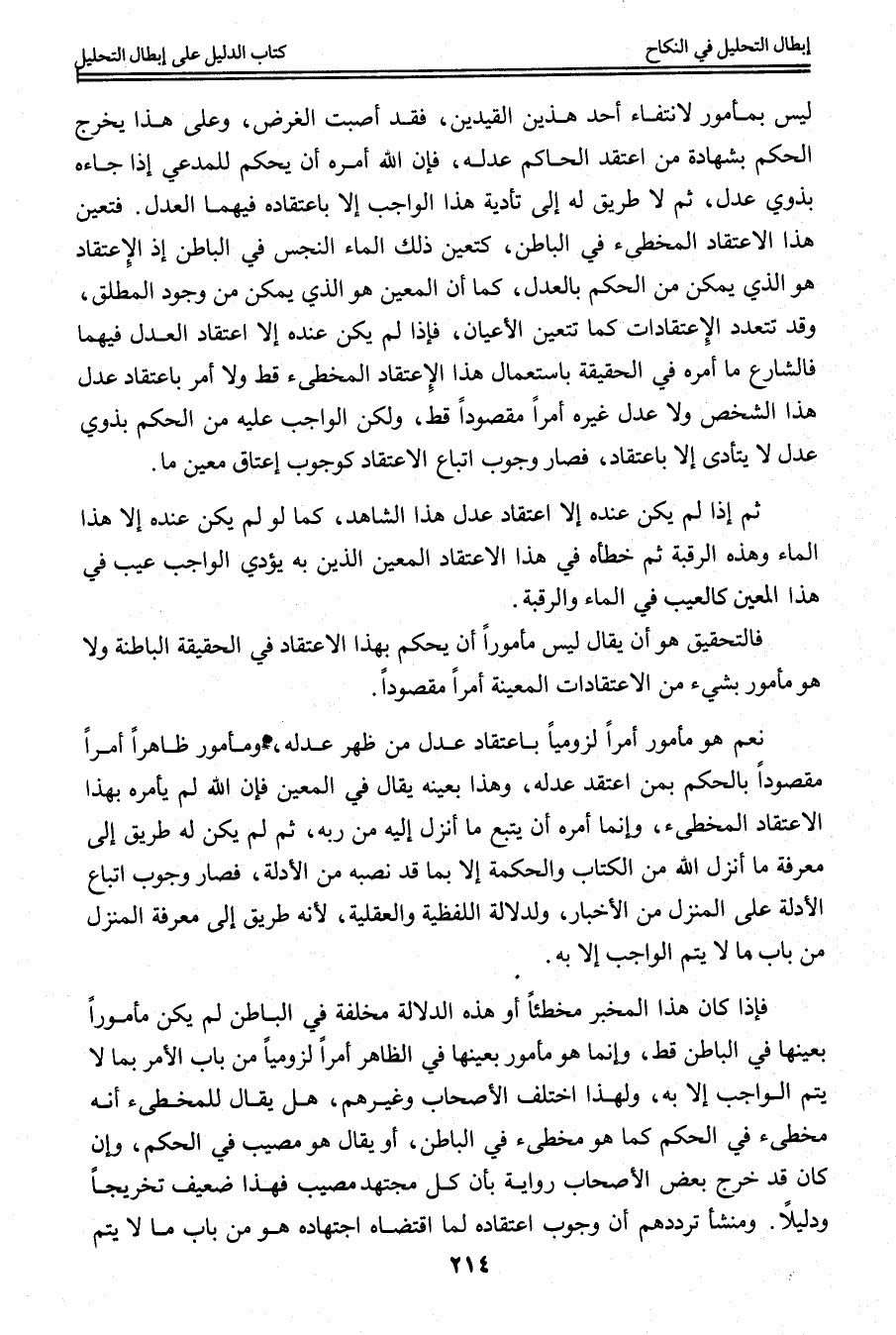ثُمَّ إذَا لَمْ يَكُنْ عِنْدَهُ إلَّا اعْتِقَادُ عَدْلِ هَذَا الشَّاهِدِ، كَمَا لَوْ لَمْ يَكُنْ عِنْدَهُ إلَّا هَذَا الْمَاءُ وَهَذِهِ الرَّقَبَةُ ثُمَّ خَطَّأَهُ فِي هَذَا الِاعْتِقَادِ الْمُعَيَّنِ الَّذِي بِهِ يُؤَدِّي الْوَاجِبَ عَيْبٌ فِي هَذَا الْمُعَيَّنِ كَالْعَيْبِ فِي الْمَاءِ وَالرَّقَبَةِ. فَالتَّحْقِيقُ هُوَ أَنْ يُقَالَ لَيْسَ مَأْمُورًا أَنْ يَحْكُمَ بِهَذَا الِاعْتِقَادِ فِي الْحَقِيقَةِ الْبَاطِنَةِ وَلَا هُوَ مَأْمُورٌ بِشَيْءٍ مِنْ الِاعْتِقَادَاتِ الْمُعَيَّنَةِ أَمْرًا مَقْصُودًا. نَعَمْ هُوَ مَأْمُورٌ أَمْرًا لُزُومِيًّا بِاعْتِقَادِ عَدْلِ مَنْ ظَهَرَ عَدْلُهُ، وَمَأْمُورٌ ظَاهِرًا أَمْرًا مَقْصُودًا بِالْحُكْمِ بِمَنْ اعْتَقَدَ عَدْلَهُ، وَهَذَا بِعَيْنِهِ يُقَالُ فِي الْمُعَيَّنِ فَإِنَّ اللَّهَ لَمْ يَأْمُرْهُ بِهَذَا الِاعْتِقَادِ الْمُخْطِئِ، وَإِنَّمَا أَمَرَهُ أَنْ يَتَّبِعَ مَا أُنْزِلَ إلَيْهِ مِنْ رَبِّهِ، ثُمَّ لَمْ يَكُنْ لَهُ طَرِيقٌ إلَى مَعْرِفَةِ مَا أَنْزَلَ اللَّهُ مِنْ الْكِتَابِ وَالْحِكْمَةِ إلَّا بِمَا قَدْ نَصَبَهُ مِنْ الْأَدِلَّةِ، فَصَارَ وُجُوبُ اتِّبَاعِ الْأَدِلَّةِ عَلَى الْمُنَزَّلِ مِنْ الْأَخْبَارِ، وَلِدَلَالَةِ اللَّفْظِيَّةِ وَالْعَقْلِيَّةِ؛ لِأَنَّهُ طَرِيقٌ إلَى مَعْرِفَةِ الْمُنَزَّلِ مِنْ بَابِ مَا لَا يَتِمُّ الْوَاجِبُ إلَّا بِهِ. فَإِذَا كَانَ هَذَا الْمُخْبِرُ مُخْطِئًا أَوْ هَذِهِ الدَّلَالَةُ مُخَلَّفَةً فِي الْبَاطِنِ لَمْ يَكُنْ مَأْمُورًا بِعَيْنِهَا فِي الْبَاطِنِ قَطُّ، وَإِنَّمَا هُوَ مَأْمُورٌ بِعَيْنِهَا فِي الظَّاهِرِ أَمْرًا لُزُومِيًّا مِنْ بَابِ الْأَمْرِ بِمَا لَا يَتِمُّ الْوَاجِبُ إلَّا بِهِ، وَلِهَذَا اخْتَلَفَ الْأَصْحَابُ وَغَيْرُهُمْ، هَلْ يُقَالُ لِلْمُخْطِئِ أَنَّهُ مُخْطِئٌ فِي الْحُكْمِ كَمَا هُوَ مُخْطِئٌ فِي الْبَاطِنِ، أَوْ يُقَالُ هُوَ مُصِيبٌ فِي الْحُكْمِ، وَإِنْ كَانَ قَدْ خَرَّجَ بَعْضُ الْأَصْحَابِ رِوَايَةً بِأَنَّ كُلَّ مُجْتَهِدٍ مُصِيبٌ فَهَذَا ضَعِيفٌ تَخْرِيجًا وَدَلِيلًا.
