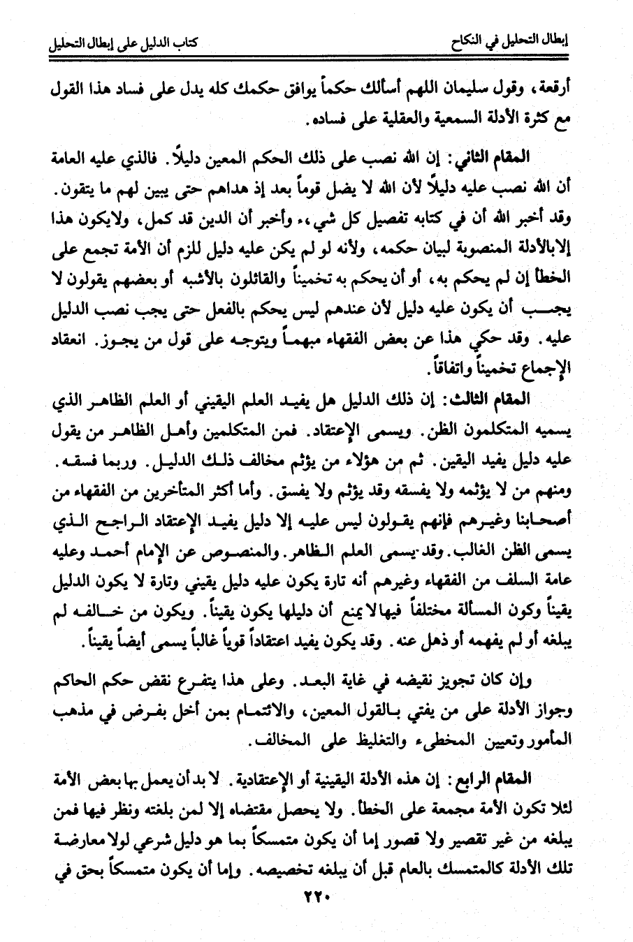 الْمَقَامُ الثَّالِثُ: أَنَّ ذَلِكَ الدَّلِيلَ هَلْ يُفِيدُ الْعِلْمَ الْيَقِينِيَّ أَوْ الْعِلْمَ الظَّاهِرَ الَّذِي يُسَمِّيهِ الْمُتَكَلِّمُونَ الظَّنَّ وَيُسَمَّى الِاعْتِقَادُ. فَمِنْ الْمُتَكَلِّمِينَ وَأَهْلِ الظَّاهِرِ مَنْ يَقُولُ عَلَيْهِ دَلِيلٌ يُفِيدُ الْيَقِينَ، ثُمَّ مِنْ هَؤُلَاءِ مَنْ يُؤَثِّمُ مُخَالِفَ ذَلِكَ الدَّلِيلِ، وَرُبَّمَا فَسَّقَهُ.