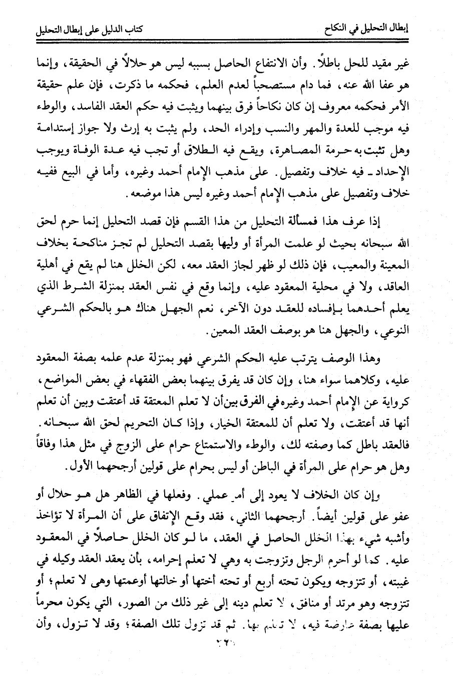 إذَا عُرِفَ هَذَا فَمَسْأَلَةُ التَّحْلِيلِ مِنْ هَذَا الْقِسْمِ فَإِنَّ قَصْدَ التَّحْلِيلِ إنَّمَا حُرِّمَ لِحَقِّ اللَّهِ سُبْحَانَهُ بِحَيْثُ لَوْ عَلِمَتْ الْمَرْأَةُ أَوْ وَلِيُّهَا بِقَصْدِ التَّحْلِيلِ لَمْ تَجُزْ مُنَاكَحَةٌ بِخِلَافِ الْمُعَيَّنَةِ وَالْمَعِيبِ، فَإِنَّ ذَلِكَ لَوْ ظَهَرَ لَجَازَ الْعَقْدُ مَعَهُ، لَكِنَّ الْخَلَلَ هُنَا لَمْ يَقَعْ فِي أَهْلِيَّةِ الْعَاقِدِ، وَلَا فِي مَحَلِّيَّةِ الْمَعْقُودِ عَلَيْهِ، وَإِنَّمَا وَقَعَ فِي نَفْسِ الْعَقْدِ بِمَنْزِلَةِ الشَّرْطِ الَّذِي يَعْلَمُ أَحَدُهُمَا بِإِفْسَادِهِ لِلْعَقْدِ دُونَ الْآخَرِ، نَعَمْ الْجَهْلُ هُنَاكَ هُوَ بِالْحُكْمِ الشَّرْعِيِّ النَّوْعِيِّ، وَالْجَهْلُ هُنَا هُوَ بِوَصْفِ الْعَقْدِ الْمُعَيَّنِ، وَهَذَا الْوَصْفُ يَتَرَتَّبُ عَلَيْهِ الْحُكْمُ الشَّرْعِيُّ فَهُوَ بِمَنْزِلَةِ عَدَمِ عِلْمِهِ بِصِفَةِ الْمَعْقُودِ عَلَيْهِ، وَكِلَاهُمَا سَوَاءٌ هُنَا، وَإِنْ كَانَ قَدْ يُفَرِّقُ بَيْنَهُمَا بَعْضُ الْفُقَهَاءِ فِي بَعْضِ الْمَوَاضِعِ، كَرِوَايَةٍ عَنْ الْإِمَامِ أَحْمَدَ وَغَيْرِهِ فِي الْفَرْقِ بَيْنَ أَنْ لَا تَعْلَمَ الْمُعْتَقَةُ قَدْ أُعْتِقَتْ وَبَيْنَ أَنْ تَعْلَمَ أَنَّهَا قَدْ أُعْتِقَتْ، وَلَا تَعْلَمَ أَنَّ لِلْمُعْتَقَةِ الْخِيَارَ وَإِذَا كَانَ التَّحْرِيمُ لِحَقِّ اللَّهِ سُبْحَانَهُ. فَالْعَقْدُ بَاطِلٌ كَمَا وَصَفْته لَك، وَالْوَطْءُ وَالِاسْتِمْتَاعُ حَرَامٌ عَلَى الزَّوْجِ فِي مِثْلِ هَذَا وِفَاقًا وَهَلْ هُوَ حَرَامٌ عَلَى الْمَرْأَةِ فِي الْبَاطِنِ أَوْ لَيْسَ بِحَرَامٍ عَلَى قَوْلَيْنِ أَرْجَحُهُمَا الْأَوَّلُ، وَإِنْ كَانَ الْخِلَافُ لَا يَعُودُ إلَى أَمْرٍ عَمَلِيٍّ، وَفَعَلَهَا فِي الظَّاهِرِ هَلْ هُوَ حَلَالٌ أَوْ عَفْوٌ عَلَى قَوْلَيْنِ أَيْضًا. أَرْجَحُهُمَا الثَّانِي، فَقَدْ وَقَعَ الِاتِّفَاقُ عَلَى أَنَّ الْمَرْأَةَ لَا تُؤَاخَذُ وَأَشْبَهُ شَيْءٍ بِهَذَا الْخَلَلِ الْحَاصِلِ فِي الْعَقْدِ، مَا لَوْ كَانَ الْخَلَلُ حَاصِلًا فِي الْمَعْقُودِ عَلَيْهِ. كَمَا لَوْ أَحْرَمَ الرَّجُلُ وَتَزَوَّجَتْ بِهِ وَهِيَ لَا تَعْلَمُ إحْرَامَهُ، بِأَنْ يَعْقِدَ الْعَقْدَ وَكِيلُهُ فِي غَيْبَتِهِ، أَوْ تَتَزَوَّجَهُ وَيَكُونُ تَحْتَهُ أَرْبَعٌ أَوْ تَحْتَهُ أُخْتُهَا أَوْ خَالَتُهَا أَوْ عَمَّتُهَا وَهِيَ لَا تَعْلَمُ؛ أَوْ تَتَزَوَّجُهُ وَهُوَ مُرْتَدٌّ أَوْ مُنَافِقٌ، لَا تَعْلَمُ دِينَهُ إلَى غَيْرِ ذَلِكَ مِنْ الصُّوَرِ، الَّتِي يَكُونُ مُحَرَّمًا عَلَيْهَا بِصِفَةٍ عَارِضَةٍ فِيهِ، لَا تَعْلَمُ بِهَا.