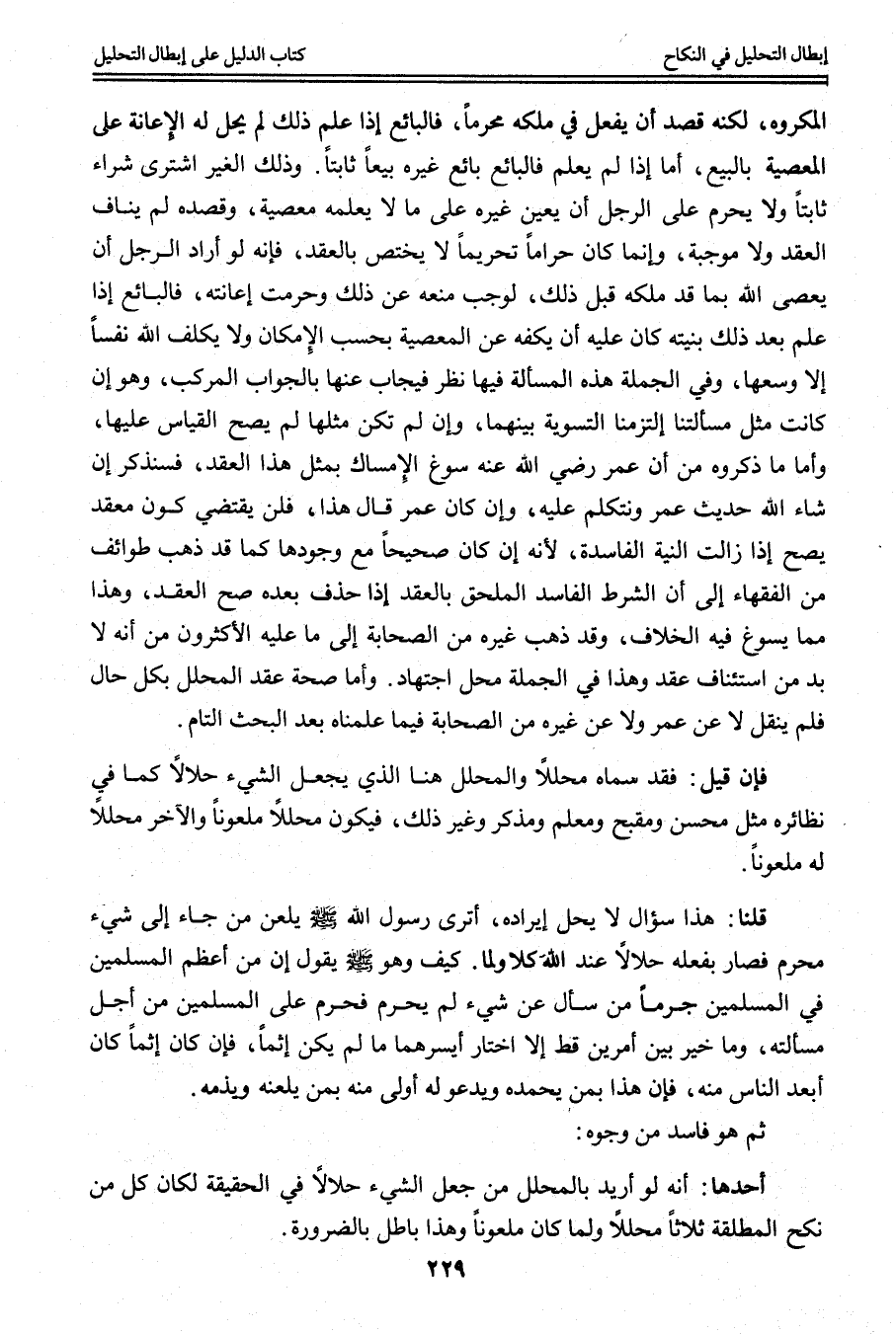 وَأَمَّا صِحَّةُ عَقْدِ الْمُحَلِّلِ بِكُلِّ حَالٍ فَلَمْ يُنْقَلْ لَا عَنْ عُمَرَ وَلَا عَنْ غَيْرِهِ مِنْ الصَّحَابَةِ فِيمَا عَلِمْنَاهُ بَعْدَ الْبَحْثِ التَّامِّ. فَإِنْ قِيلَ: فَقَدْ سَمَّاهُ مُحَلِّلًا وَالْمُحَلِّلُ هُنَا الَّذِي يَجْعَلُ الشَّيْءَ حَلَالًا كَمَا فِي نَظَائِرِهِ مِثْلُ مُحَسِّنٍ وَمُقَبِّحٍ وَمُعَلِّمٍ وَمُذَكِّرٍ وَغَيْرِ ذَلِكَ، فَيَكُونُ مُحَلِّلًا مَلْعُونًا وَالْآخَرُ مُحَلَّلًا لَهُ مَلْعُونًا. قُلْنَا: هَذَا سُؤَالٌ لَا يَحِلُّ إيرَادُهُ، أَتَرَى رَسُولَ اللَّهِ - صَلَّى اللَّهُ عَلَيْهِ وَسَلَّمَ - «يَلْعَنُ مَنْ جَاءَ إلَى شَيْءٍ مُحَرَّمٍ فَصَارَ بِفِعْلِهِ حَلَالًا عِنْدَ اللَّهِ» كَلًّا وَلَمَّا، كَيْفَ وَهُوَ - صَلَّى اللَّهُ عَلَيْهِ وَسَلَّمَ - يَقُولُ «إنَّ مِنْ أَعْظَمِ الْمُسْلِمِينَ فِي الْمُسْلِمِينَ جُرْمًا مَنْ سَأَلَ عَنْ شَيْءٍ لَمْ يُحَرَّمْ فَحُرِّمَ عَلَى الْمُسْلِمِينَ مِنْ أَجْلِ مَسْأَلَتِهِ» ، «وَمَا خُيِّرَ بَيْنَ أَمْرَيْنِ قَطُّ إلَّا اخْتَارَ أَيْسَرَهُمَا مَا لَمْ يَكُنْ إثْمًا، فَإِنْ كَانَ إثْمًا كَانَ أَبْعَدَ النَّاسِ مِنْهُ» ، فَإِنَّ هَذَا بِمَنْ يَحْمَدُهُ وَيَدْعُو لَهُ أَوْلَى مِنْهُ بِمَنْ يَلْعَنُهُ وَيَذُمُّهُ. ثُمَّ هُوَ فَاسِدٌ مِنْ وُجُوهٍ. أَحَدُهَا: أَنَّهُ لَوْ أُرِيدَ بِالْمُحَلِّلِ مَنْ جَعَلَ الشَّيْءَ حَلَالًا فِي الْحَقِيقَةِ لَكَانَ كُلُّ مَنْ نَكَحَ الْمُطَلَّقَةَ ثَلَاثًا مُحَلِّلًا وَلَمَا كَانَ مَلْعُونًا وَهَذَا بَاطِلٌ بِالضَّرُورَةِ