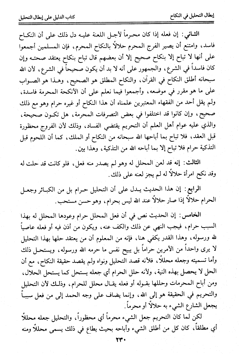 الثَّالِثُ: أَنَّهُ قَدْ لَعَنَ الْمُحَلَّلَ لَهُ وَهُوَ لَمْ يَصْدُرْ مِنْهُ فِعْلٌ، فَلَوْ كَانَتْ قَدْ حَلَّتْ لَهُ وَقَدْ نَكَحَ امْرَأَةً حَلَالًا لَهُ لَمْ يَجُزْ لَعْنُهُ عَلَى ذَلِكَ. الرَّابِعُ: إنَّ هَذَا الْحَدِيثَ يَدُلُّ عَلَى أَنَّ التَّحْلِيلَ حَرَامٌ بَلْ مِنْ الْكَبَائِرِ وَجَعْلُ الْحَرَامِ حَلَالًا إذَا صَارَ حَلَالًا عِنْدَ اللَّهِ لَيْسَ بِحَرَامٍ، وَهُوَ حَسَنٌ مُسْتَحَبٌّ. الْخَامِسُ: أَنَّ الْحَدِيثَ نَصَّ فِي أَنَّ فِعْلَ الْمُحَلِّلَ حَرَامٌ وَعَوْدُهَا لِلْمُحَلَّلِ لَهُ بِهَذَا السَّبَبِ حَرَامٌ، فَيَجِبُ النَّهْيُ عَنْ ذَلِكَ وَالْكَفُّ عَنْهُ، وَيَكُونُ مَنْ أَذِنَ فِيهِ أَوْ فَعَلَهُ عَاصِيًا لِلَّهِ وَرَسُولِهِ، وَهَذَا الْقَدْرُ يَكْفِي هُنَا، فَإِنَّهُ مِنْ الْمَعْلُومِ أَنَّ مَنْ يَعْتَقِدُ حِلَّهَا بِهَذَا التَّحْلِيلِ لَا يَرَى وَاحِدًا مِنْ الْأَمْرَيْنِ حَرَامًا بَلْ يُبِيحُ نَفْسَ مَا حَرَّمَهُ اللَّهُ وَرَسُولُهُ، وَيَسْتَحِلُّ ذَلِكَ وَأَمَّا تَسْمِيَتُهُ وَجَعْلُهُ مُحَلِّلًا، فَلِأَنَّهُ قَصَدَ التَّحْلِيلَ وَنَوَاهُ وَلَمْ يَقْصِدْ حَقِيقَةَ النِّكَاحِ، مَعَ أَنَّ الْحِلَّ لَا يَحْصُلُ بِهَذِهِ النِّيَّةِ، وَلِأَنَّهُ حَلَّلَ الْحَرَامَ أَيْ جَعَلَهُ يُسْتَحَلُّ كَمَا يُسْتَحَلُّ الْحَلَالُ، وَمَنْ أَبَاحَ الْمُحَرَّمَاتِ وَحَلَّلَهَا بِقَوْلِهِ أَوْ فِعْلِهِ يُقَالُ مُحَلِّلٌ لِلْحَرَامِ، وَذَلِكَ؛ لِأَنَّ التَّحْلِيلَ وَالتَّحْرِيمَ فِي الْحَقِيقَةِ هُوَ إلَى اللَّهِ، وَإِنَّمَا يُضَافُ عَلَى وَجْهِ الْحَمْدِ إلَى مَنْ فَعَلَ سَبَبًا يَجْعَلُ الشَّارِعُ الشَّيْءَ بِهِ حَلَالًا أَوْ مُحَرَّمًا.