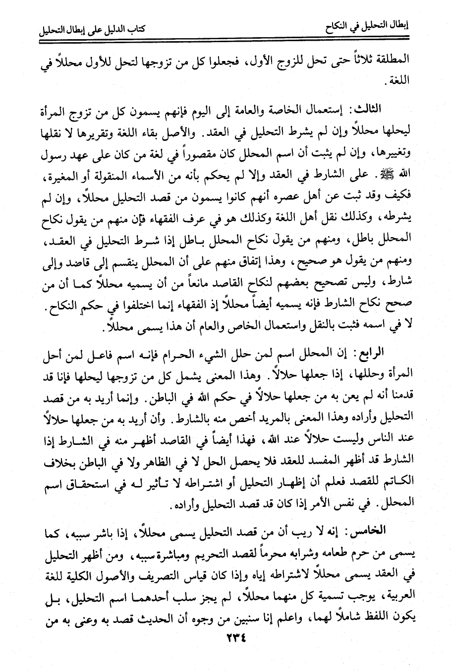 وَالْأَصْلُ بَقَاءُ اللُّغَةِ وَتَقْرِيرُهَا لَا نَقْلُهَا وَتَغْيِيرُهَا، وَإِنْ لَمْ يَثْبُتْ أَنَّ اسْمَ الْمُحَلِّلِ كَانَ مَقْصُورًا فِي لُغَةِ مَنْ كَانَ عَلَى عَهْدِ رَسُولِ اللَّهِ - صَلَّى اللَّهُ عَلَيْهِ وَسَلَّمَ -. عَلَى الشَّارِطِ فِي الْعَقْدِ وَإِلَّا لَمْ يَحْكُمْ بِأَنَّهُ مِنْ الْأَسْمَاءِ الْمَنْقُولَةِ أَوْ الْمُغَيَّرَةِ، فَكَيْفَ وَقَدْ ثَبَتَ عَنْ أَهْلِ عَصْرِهِ أَنَّهُمْ كَانُوا يُسَمُّونَ مَنْ قَصَدَ التَّحْلِيلَ مُحَلِّلًا، وَإِنْ لَمْ يَشْرِطْهُ، وَكَذَلِكَ نَقَلَ أَهْلُ اللُّغَةِ وَكَذَلِكَ هُوَ فِي عُرْفِ الْفُقَهَاءِ فَإِنَّ مِنْهُمْ مَنْ يَقُولُ نِكَاحُ الْمُحَلِّلِ بَاطِلٌ، وَمِنْهُمْ مَنْ يَقُولُ نِكَاحُ الْمُحَلِّلِ بَاطِلٌ إذَا شَرَطَ التَّحْلِيلَ فِي الْعَقْدِ، وَمِنْهُمْ مَنْ يَقُولُ هُوَ صَحِيحٌ، وَهَذَا اتِّفَاقٌ مِنْهُمْ عَلَى أَنَّ الْمُحَلِّلَ يَنْقَسِمُ إلَى قَاصِدٍ وَإِلَى شَارِطٍ، وَلَيْسَ تَصْحِيحُ بَعْضِهِمْ لِنِكَاحِ الْقَاصِدِ مَانِعًا مِنْ أَنْ يُسَمِّيَهُ مُحَلِّلًا كَمَا أَنَّ مَنْ صَحَّحَ نِكَاحَ الشَّارِطِ فَإِنَّهُ يُسَمِّيهِ أَيْضًا مُحَلِّلًا إذْ الْفُقَهَاءُ إنَّمَا اخْتَلَفُوا فِي حُكْمِ النِّكَاحِ. لَا فِي اسْمِهِ فَثَبَتَ بِالنَّقْلِ وَاسْتِعْمَالِ الْخَاصِّ وَالْعَامِّ أَنَّ هَذَا يُسَمَّى مُحَلِّلًا.
