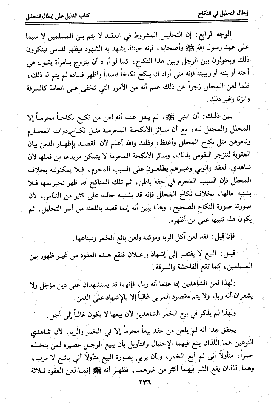 الْوَجْهُ الرَّابِعُ: أَنَّ التَّحْلِيلَ الْمَشْرُوطَ فِي الْعَقْدِ لَا يَتِمُّ بَيْنَ الْمُسْلِمِينَ لَا سِيَّمَا عَلَى عَهْدِ رَسُولِ اللَّهِ - صَلَّى اللَّهُ عَلَيْهِ وَسَلَّمَ - وَأَصْحَابِهِ، فَإِنَّهُ حِينَئِذٍ يَشْهَدُ بِهِ الشُّهُودُ فَيَظْهَرُ لِلنَّاسِ فَيُنْكِرُونَ ذَلِكَ وَيَحُولُونَ بَيْنَ الرَّجُلِ وَبَيْنَ هَذَا النِّكَاحِ، كَمَا لَوْ أَرَادَ أَنْ يَتَزَوَّجَ بِامْرَأَةٍ يَقُولُ هِيَ أُخْتُهُ أَوْ بِنْتُهُ أَوْ رَبِيبَتُهُ فَإِنَّهُ مَتَى أَرَادَ أَنْ يَنْكِحَ نِكَاحًا فَاسِدًا وَأَظْهَرَ فَسَادَهُ لَمْ يَتِمَّ لَهُ ذَلِكَ، فَلَمَّا لَعَنَ الْمُحَلِّلَ زَجْرًا عَنْ ذَلِكَ عُلِمَ أَنَّهُ مِنْ الْأُمُورِ الَّتِي تَخْفَى عَلَى الْعَامَّةِ كَالسَّرِقَةِ وَالزِّنَا وَغَيْرِ ذَلِكَ.