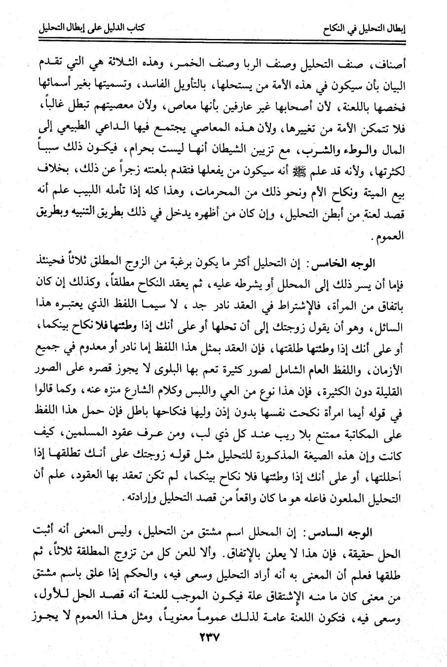 الْوَجْهُ الْخَامِسُ: أَنَّ التَّحْلِيلَ أَكْثَرُ مَا يَكُونُ بِرَغْبَةٍ مِنْ الزَّوْجِ الْمُطَلِّقِ ثَلَاثًا فَحِينَئِذٍ فَإِمَّا أَنْ يُسِرَّ ذَلِكَ إلَى الْمُحَلِّلِ أَوْ يَشْرِطَهُ عَلَيْهِ، ثُمَّ يَعْقِدَ النِّكَاحَ مُطْلَقًا، وَكَذَلِكَ إنْ كَانَ بِاتِّفَاقٍ مِنْ الْمَرْأَةِ، فَالِاشْتِرَاطُ فِي الْعَقْدِ نَادِرٌ جِدًّا، لَا سِيَّمَا اللَّفْظُ الَّذِي يَعْتَبِرُهُ هَذَا السَّائِلُ، وَهُوَ أَنْ يَقُولَ زَوَّجْتُك إلَى أَنْ تُحِلَّهَا أَوْ عَلَى أَنَّك إذَا وَطِئْتهَا فَلَا نِكَاحَ بَيْنَكُمَا، أَوْ عَلَى أَنَّك إذَا وَطِئْتهَا طَلَّقْتهَا، فَإِنَّ الْعَقْدَ بِمِثْلِ هَذَا اللَّفْظِ إمَّا نَادِرٌ أَوْ مَعْدُومٌ فِي جَمِيعِ الْأَزْمَانِ، وَاللَّفْظُ الْعَامُّ الشَّامِلُ لِصُوَرٍ كَثِيرَةٍ تَعُمُّ بِهَا الْبَلْوَى لَا يَجُوزُ قَصْرُهُ عَلَى الصُّوَرِ الْقَلِيلَةِ دُونَ الْكَثِيرَةِ، فَإِنَّ هَذَا نَوْعٌ مِنْ الْعَيِّ وَاللَّبْسِ وَكَلَامُ الشَّارِعِ مُنَزَّهٌ عَنْهُ، وَكَمَا قَالُوا فِي قَوْلِهِ «أَيُّمَا امْرَأَةٍ نَكَحَتْ نَفْسَهَا بِدُونِ إذْنِ وَلِيِّهَا فَنِكَاحُهَا بَاطِلٌ» فَإِنَّ حَمْلَ هَذَا اللَّفْظِ عَلَى الْمُكَاتَبَةِ مُمْتَنِعٌ بِلَا رَيْبٍ عِنْدَ كُلِّ ذِي لُبٍّ، وَمَنْ عَرَفَ عُقُودَ الْمُسْلِمِينَ، كَيْفَ كَانَتْ إنَّ هَذِهِ الصِّيغَةَ الْمَذْكُورَةَ لِلتَّحْلِيلِ مِثْلُ قَوْلِهِ زَوَّجْتُك عَلَى أَنَّك تُطَلِّقُهَا إذَا أَحْلَلْتهَا، أَوْ عَلَى أَنَّك إذَا وَطِئْتهَا فَلَا نِكَاحَ بَيْنَكُمَا، لَمْ تَكُنْ تُعْقَدُ بِهَا الْعُقُودُ، عُلِمَ أَنَّ التَّحْلِيلَ الْمَلْعُونَ فَاعِلَهُ هُوَ مَا كَانَ وَاقِعًا مِنْ قَصْدِ التَّحْلِيلِ وَإِرَادَتِهِ.