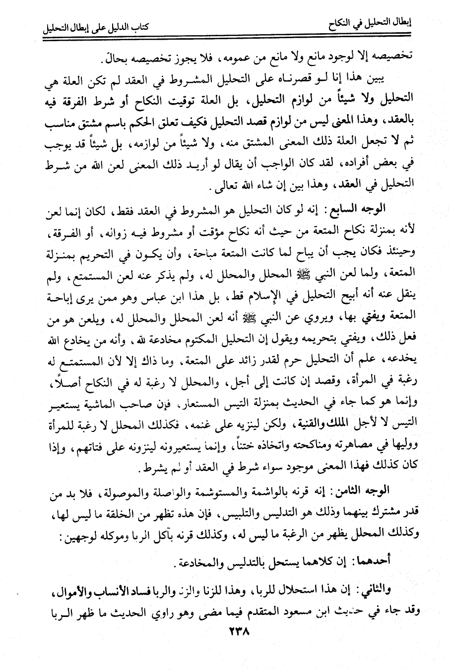 الْوَجْهُ السَّابِعُ: أَنَّهُ لَوْ كَانَ التَّحْلِيلُ هُوَ الْمَشْرُوطَ فِي الْعَقْدِ فَقَطْ، لَكَانَ إنَّمَا لُعِنَ؛ لِأَنَّهُ بِمَنْزِلَةِ نِكَاحِ الْمُتْعَةِ مِنْ حَيْثُ إنَّهُ نِكَاحٌ مُؤَقَّتٌ أَوْ مَشْرُوطٌ فِيهِ زَوَالَهُ، أَوْ الْفُرْقَةَ، وَحِينَئِذٍ فَكَانَ يَجِبُ أَنْ يُبَاحَ لَمَّا كَانَتْ الْمُتْعَةُ مُبَاحَةً، وَأَنْ يَكُونَ فِي التَّحْرِيمِ بِمَنْزِلَةِ الْمُتْعَةِ، وَلَمَّا «لَعَنَ النَّبِيُّ - صَلَّى اللَّهُ عَلَيْهِ وَسَلَّمَ - الْمُحَلِّلَ وَالْمُحَلَّلَ لَهُ» ، وَلَمْ يُذْكَرْ عَنْهُ لَعْنُ الْمُسْتَمْتِعِ، وَلَمْ يُنْقَلْ عَنْهُ أَنَّهُ أُبِيحَ التَّحْلِيلُ فِي الْإِسْلَامِ قَطُّ، بَلْ هَذَا ابْنُ عَبَّاسٍ وَهُوَ مِمَّنْ يَرَى إبَاحَةَ الْمُتْعَةِ وَيُفْتِي بِهَا، وَيَرْوِي عَنْ النَّبِيِّ - صَلَّى اللَّهُ عَلَيْهِ وَسَلَّمَ - أَنَّهُ لَعَنَ الْمُحَلِّلَ وَالْمُحَلَّلَ لَهُ، وَيَلْعَنُ هُوَ مَنْ فَعَلَ ذَلِكَ، وَيُفْتِي بِتَحْرِيمِهِ وَيَقُولُ إنَّ التَّحْلِيلَ الْمَكْتُومَ مُخَادَعَةٌ لِلَّهِ، وَأَنَّهُ مَنْ يُخَادِعْ اللَّهَ يَخْدَعْهُ، عُلِمَ أَنَّ التَّحْلِيلَ حُرِّمَ لِقَدْرٍ زَائِدٍ عَلَى الْمُتْعَةِ، وَمَا ذَاكَ إلَّا؛ لِأَنَّ الْمُسْتَمْتِعَ لَهُ رَغْبَةٌ فِي الْمَرْأَةِ، وَقَصَدَ إنْ كَانَتْ إلَى أَجَلٍ، وَالْمُحَلِّلَ لَا رَغْبَةَ لَهُ فِي النِّكَاحِ أَصْلًا، وَإِنَّمَا هُوَ كَمَا جَاءَ فِي الْحَدِيثِ بِمَنْزِلَةِ التَّيْسِ الْمُسْتَعَارِ، فَإِنَّ صَاحِبَ الْمَاشِيَةِ يَسْتَعِيرُ التَّيْسَ لَا لِأَجْلِ الْمِلْكِ وَالْقِنْيَةِ، وَلَكِنْ لِيُنْزِيَهُ عَلَى غَنَمِهِ، فَكَذَلِكَ الْمُحَلِّلُ لَا رَغْبَةَ لِلْمَرْأَةِ وَوَلِيِّهَا فِي مُصَاهَرَتِهِ وَمُنَاكَحَتِهِ وَاِتِّخَاذِهِ خَتَنًا، وَإِنَّمَا يَسْتَعِيرُونَهُ لِيُنْزُونَهُ عَلَى فَتَاتِهِمْ، وَإِذَا كَانَ كَذَلِكَ فَهَذَا الْمَعْنَى مَوْجُودٌ سَوَاءٌ شُرِطَ فِي الْعَقْدِ أَوْ لَمْ يُشْرَطْ.